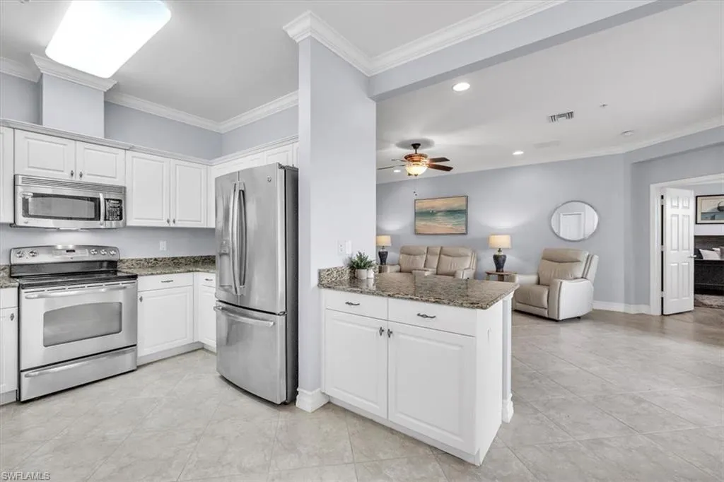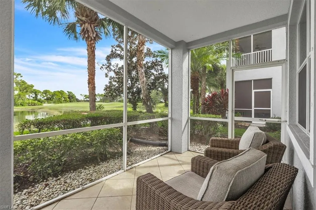 Welcome to this exquisite first-floor corner condo at 16571 Goldenrod Lane #103 in the prestigious Ashton Oaks community at River Hall, where serene lakefront living meets unparalleled resort-style amenities. Spanning 1,784 square feet of thoughtfully designed space, this TURNKEY 2-bedroom + den, 2-bathroom haven, built in 2009, offers breathtaking long water views from your private lanai, with glimpses of the championship golf course’s 17th hole and lush wooded preserves beyond. Step inside to discover a neutrally decorated interior boasting elegant tile flooring laid on a striking diagonal, complemented by high-end stainless steel appliances in the open-concept kitchen. Adding a touch of timeless sophistication are the plantation shutters that grace the windows, providing both privacy and a classic coastal charm while allowing soft natural light to filter in.