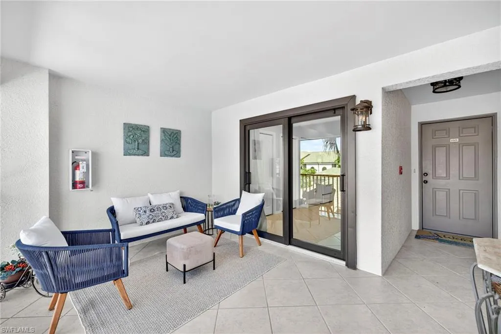 Additional highlights include tile flooring throughout, fresh paint, updated finishes, and an included garage. The building has been recently upgraded with new impact doors and windows, exterior paint, new screens, and bronze railings.
