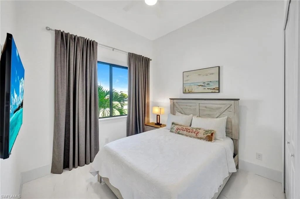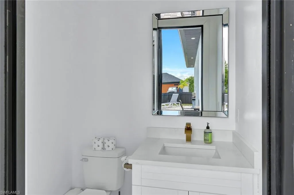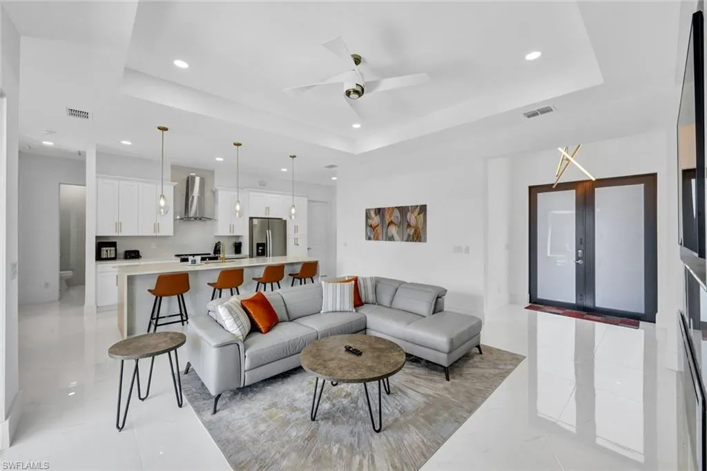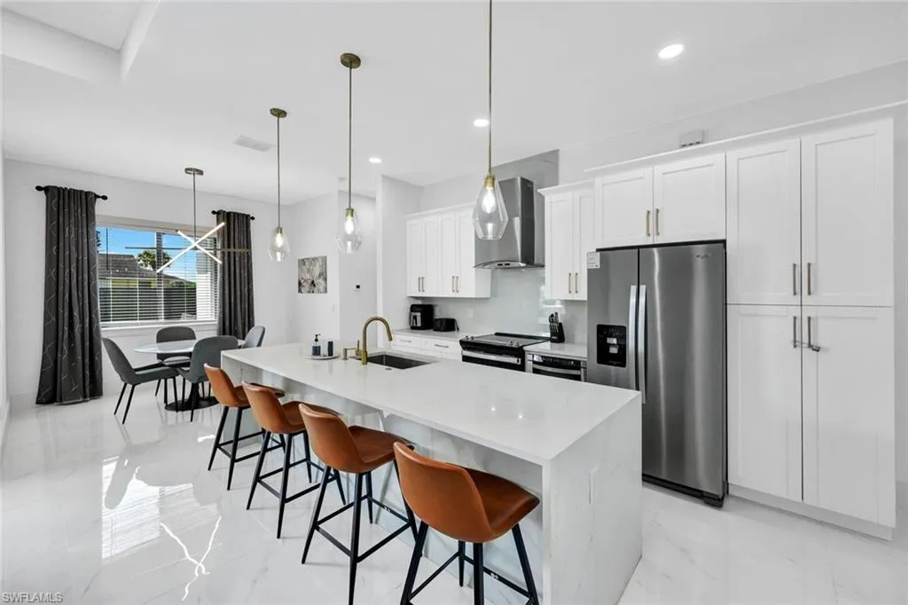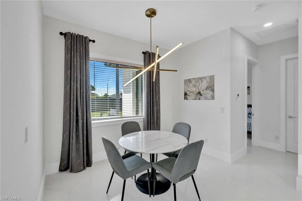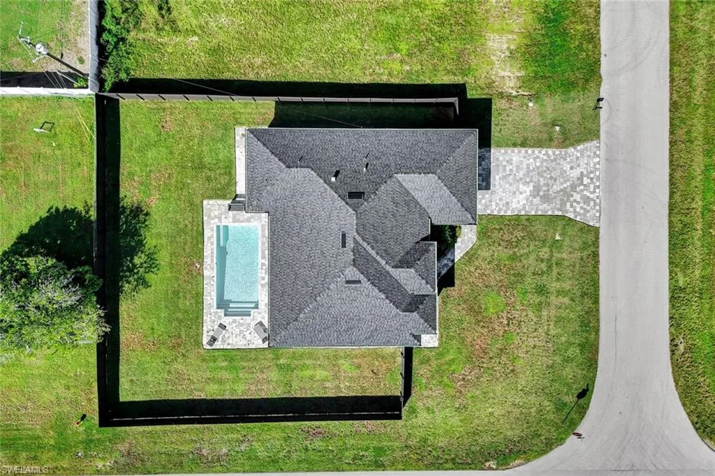 Located in desirable Northeast Cape Coral, this stunning single-family home offers the perfect blend of modern design and luxurious outdoor living. Built less than a year ago, the 1,735-square-foot residence features 4 bedrooms and 2.5 bathrooms, with every detail thoughtfully upgraded. The chef-inspired kitchen boasts rich wood cabinetry, quartz countertops, stainless steel appliances, and a sleek open layout that flows seamlessly into the living and dining spaces. The primary suite impresses with walk-in closets and a spa-like bathroom complete with a walk-in shower and multiple shower heads for a resort-style experience. Outside, the large corner lot is fully fenced for privacy and designed for entertaining, showcasing a sparkling pool, outdoor kitchen that includes a full-size sink, gas cooktop, and wine storage. Brick pavers extend across the pool deck and all around the home, creating a cohesive, high-end finish. Additional highlights include an outdoor shower, impact windows and doors for peace of mind, and the added benefit of all city assessments fully paid. This home embodies the best of contemporary Florida living in a sought-after Cape Coral location.
