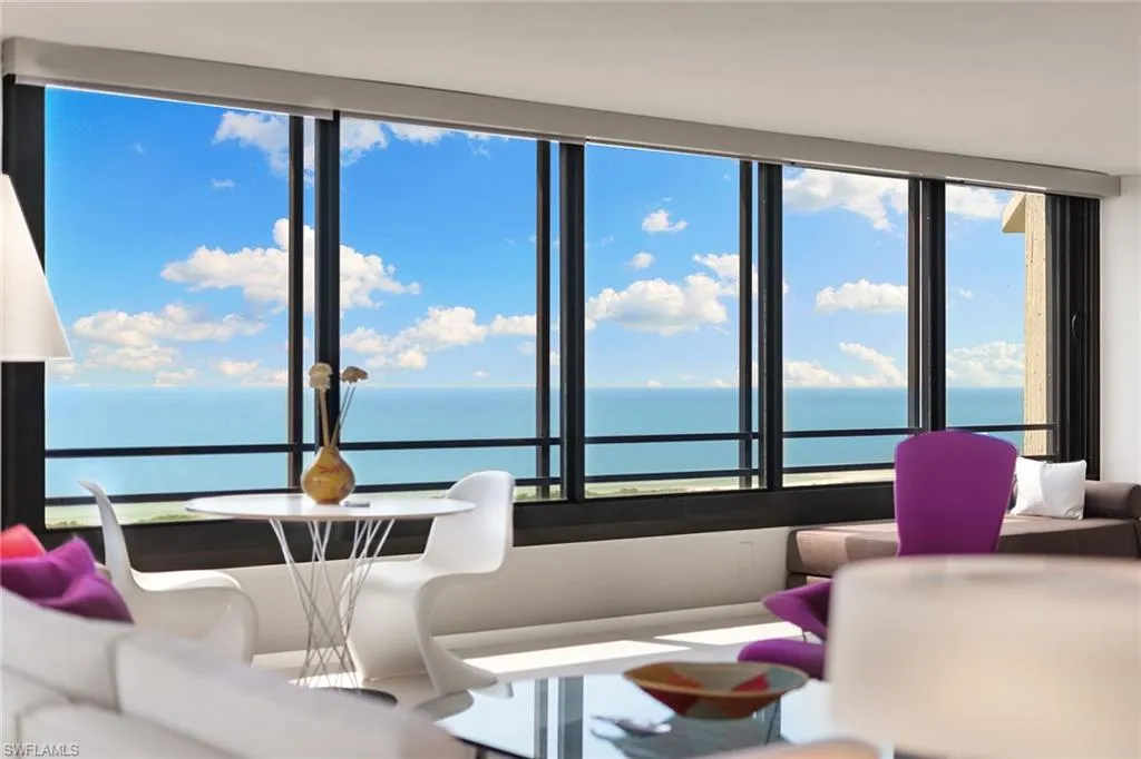 Commanding one of the enviable positions in Pelican Bay, this 20th-floor residence in The Heron offers sweeping views from the Gulf of Mexico to the city skyline of Naples and Park Shore. This condominium was designed by architect Robert Kleinschmidt and thoughtfully renovated in 2013, the home reflects a timeless modern aesthetic with elevated finishes throughout. A design-forward kitchen with Italian matte-white cabinetry, quartz countertops and premium appliances features a built-in high-top dining area overlooking Clam Pass. The primary suite captures sunrise and coastal views, with a spacious walk-in closet and fully renovated bath. The guest suite offers equal comfort with long-range views and its updated en-suite bath. The open-concept layout is enhanced by full-height glass windows that frame panoramic views and fill the living spaces with natural light. Thoughtful interior planning emphasizes the residence’s visual connection to the coastline while offering a seamless flow for everyday living and entertaining. The Heron is a boutique building with only 40 residences and includes on-site management, two guest suites, a fitness center with infrared sauna, tropical pool and spa. Ideally near Artis—Naples and Waterside Shops, this residence offers rare Gulf-front privacy with easy access to dining and cultural venues.