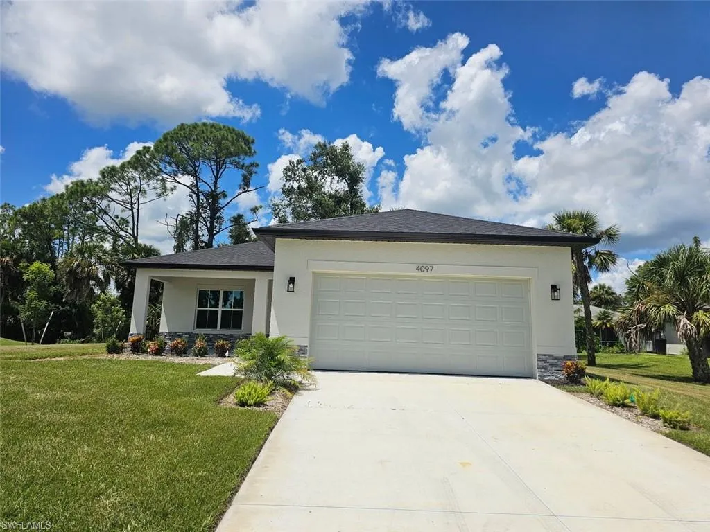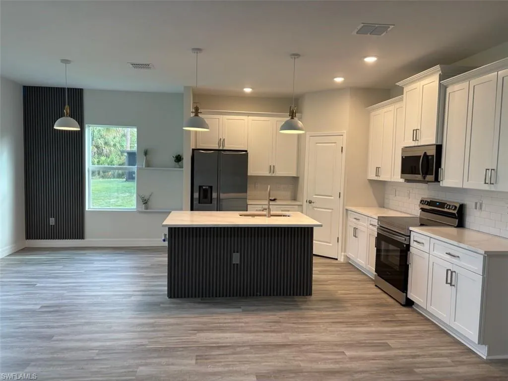 This exquisite 1,615-square-foot corner modern home is ready for immediate move-in. Showcasing 3 bedrooms and 2 bathrooms, this residence sets a new standard for sophisticated living. Step inside to experience premium finishes throughout. The heart of this home features a stunning chef’s kitchen equipped with Samsung stainless steel appliances and a spacious center island, complemented by white subway tile backsplashes and quartz countertops. Includes Washer and Dryer. Beautiful Reef Gold vinyl plank flooring flows seamlessly throughout – no carpet to maintain. Details on interior decoration with dramatic ceilings create an airy atmosphere, enhanced by Maxim lighting fixtures and Moen Chateau Chrome accents. An elegant paved driveway that provides both convenience and appeal. The property features a professional irrigation system and is on an oversized corner 0.31-acre private lot. Built for efficiency and peace of mind, this home includes an energy-efficient Goodman trane system, single-panel vinyl windows, and doors.