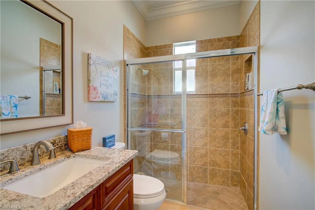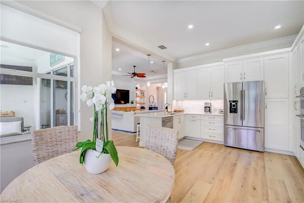 Beautifully renovated and ideally located just steps from the clubhouse and resort amenities, this 3-bedroom, 3-bath pool home in Vasari Country Club offers luxury living with quality craftsmanship, stylish finishes, and a new roof among its many thoughtful updates. The dream kitchen is designed for both beauty and functionality, featuring custom cabinetry, elegant hardware and faucet, and a full suite of 2022 KitchenAid appliances—including a refrigerator, dishwasher, convection wall oven/microwave, and cooktop—along with a Whirlpool beverage fridge. Wide-plank luxury vinyl flooring flows throughout the main living areas, creating a modern and cohesive space. The open great room is an entertainer’s dream, with a custom shiplap-paneled entertainment wall, built-in shelving, and a mounted television. A wall of three-panel glass sliders opens to your private lanai, where you’ll enjoy beautiful views of the pool, tranquil lake, and Vasari’s 18th hole. The spacious owner’s suite has direct access to the lanai and features a spa-like bath with dual vanities and a separate water closet. The split-bedroom layout includes two generous guest bedrooms, offering privacy and comfort for family and friends. Extensive improvements include: a brand-new roof and gutters (2025), full exterior paint (2025), remodeled kitchen (2022), new luxury vinyl flooring (2022), new Built Right pool heater and pump (2023), remodeled living room with complete interior paint including doors, trim, ceilings, and closets (2023), new carpet in guest bedrooms (2023), new hot water heater and overhead garage storage (2021), and refreshed landscaping (2022). This home includes immediate golf membership with full access to Vasari’s extensive amenities. Enjoy 18 holes of championship golf, tennis on lighted Har-Tru courts, bocce, a resort-style pool and spa, a vibrant social calendar, and coming soon—pickleball. The elegant clubhouse features both formal and casual dining, locker rooms, and game and meeting spaces. Ideally located near Gulf beaches, I-75, and US-41, with convenient access to Naples and Fort Myers, top dining spots, shopping destinations, cultural venues, and scenic biking trails. This home is truly move-in ready—offering modern elegance, ideal indoor-outdoor living, and a vibrant resort lifestyle in one of Bonita Springs’ most sought-after communities.