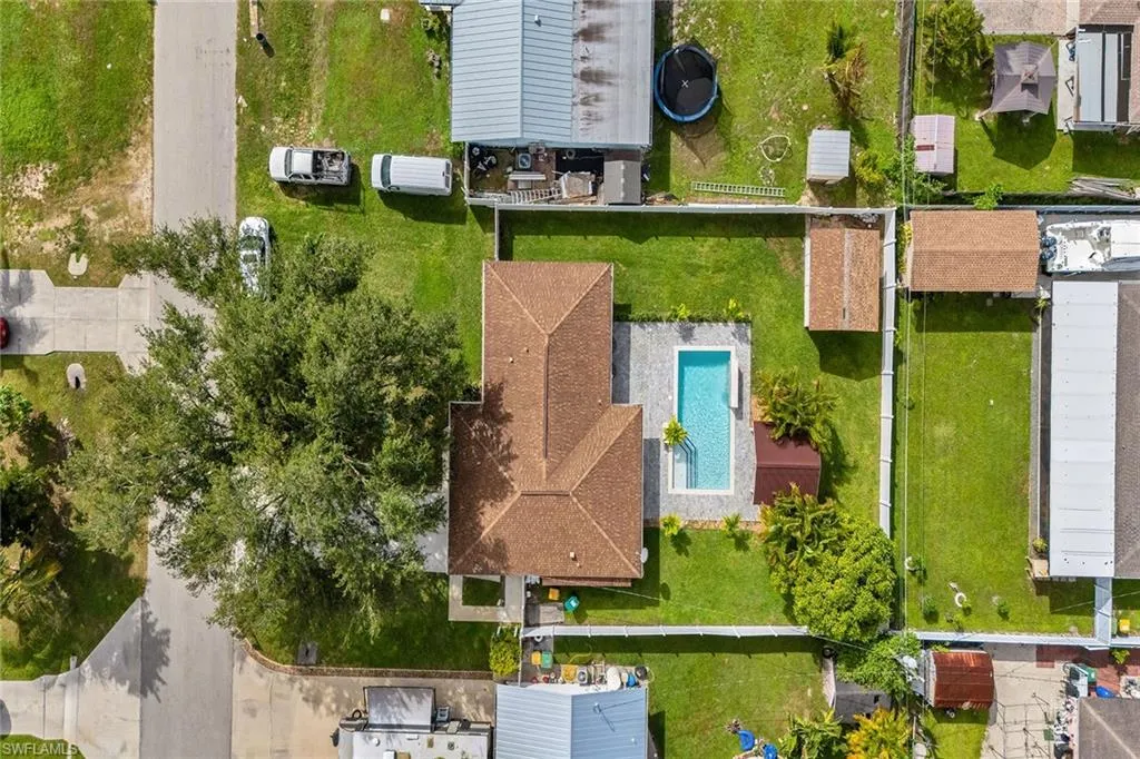 Experience the best of Naples living in this beautifully maintained single-family home offering southern exposure, a new heated saltwater pool with a waterfall feature (2023), and a spacious gazebo perfect for relaxing or entertaining. With no HOA fees or restrictions, this property provides exceptional freedom and convenience in a desirable Golden Gate City location close to schools, parks, shopping, dining, and just 15–20 minutes from downtown Naples and the beaches. The inviting layout features three bedrooms and two bathrooms, with one of the guest rooms converted from a garage into a versatile suite complete with a kitchenette, sink, and overhead cabinetry, ideal for extended family or guests. Inside, diagonal tile flooring flows throughout the main living areas, creating a cohesive and easy-care design. The cozy living room features a window that fills the space with natural light and a modern ceiling fan for comfort. The kitchen is well-appointed with shaker-style cabinetry, sleek modern countertops, and appliances, including a range, microwave, dishwasher, and refrigerator with icemaker. An adjacent formal dining area with sliding glass doors opens to the back patio, providing effortless indoor-outdoor living. The owner’s suite is a peaceful retreat with a walk-in closet and an en-suite bath featuring a modern vanity and shower-tub combination. Two additional guest bedrooms share an updated bath with a walk-in shower, offering ample space and privacy for family or visitors. Step outside to your own private oasis. The fully fenced backyard showcases updated landscaping and a patio with brick paver flooring. The sparkling saltwater pool and gazebo create an inviting setting for outdoor enjoyment year-round. Additional updates include a newer roof (2020) and a washer and dryer. Located in Flood Zone X, this home offers lower insurance costs with no flood insurance required, making it an exceptional opportunity for both comfort and peace of mind.