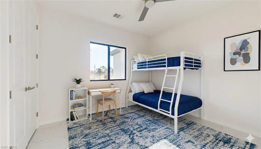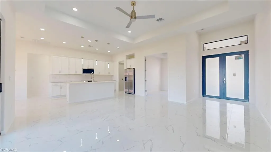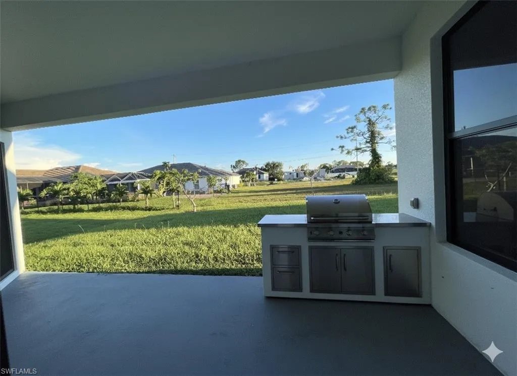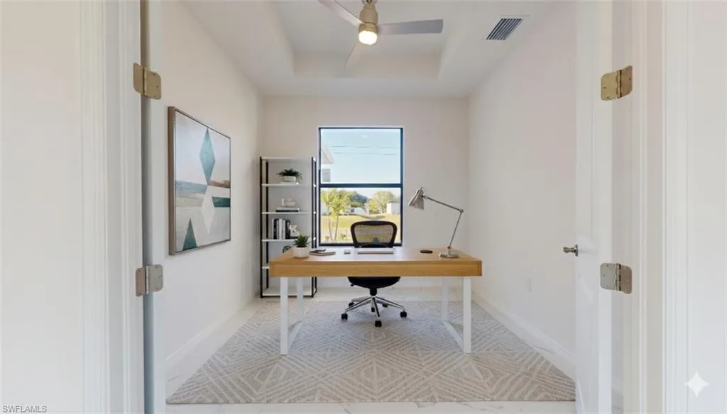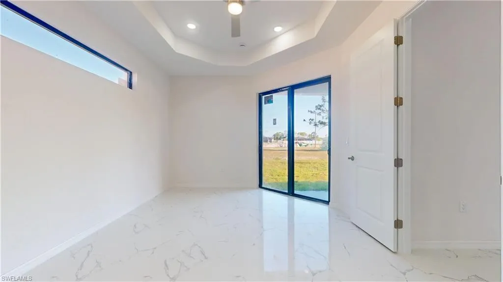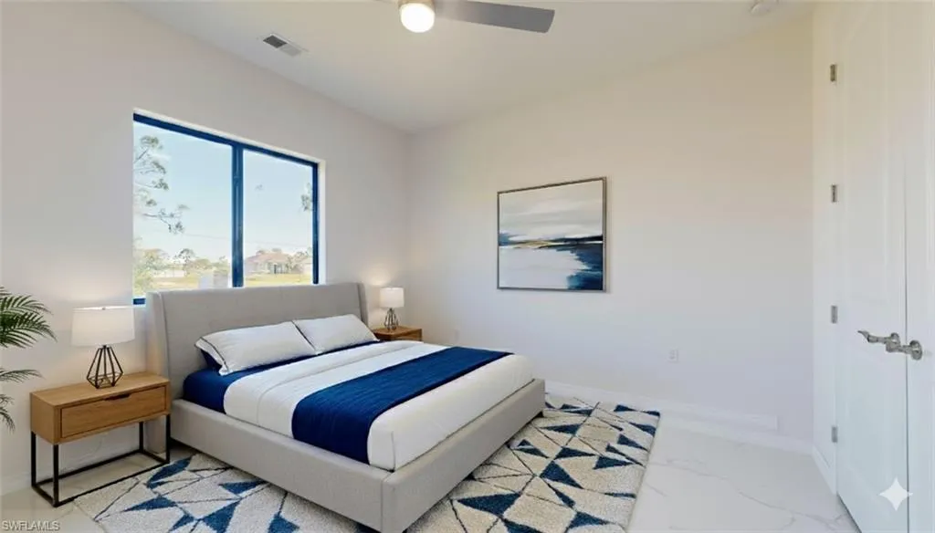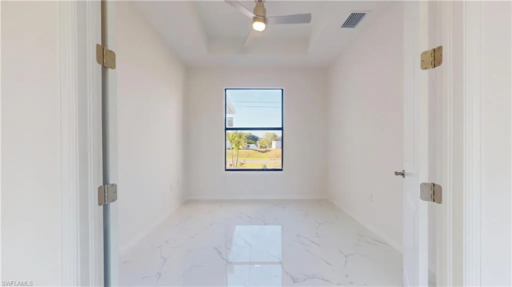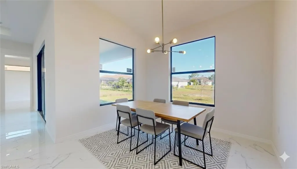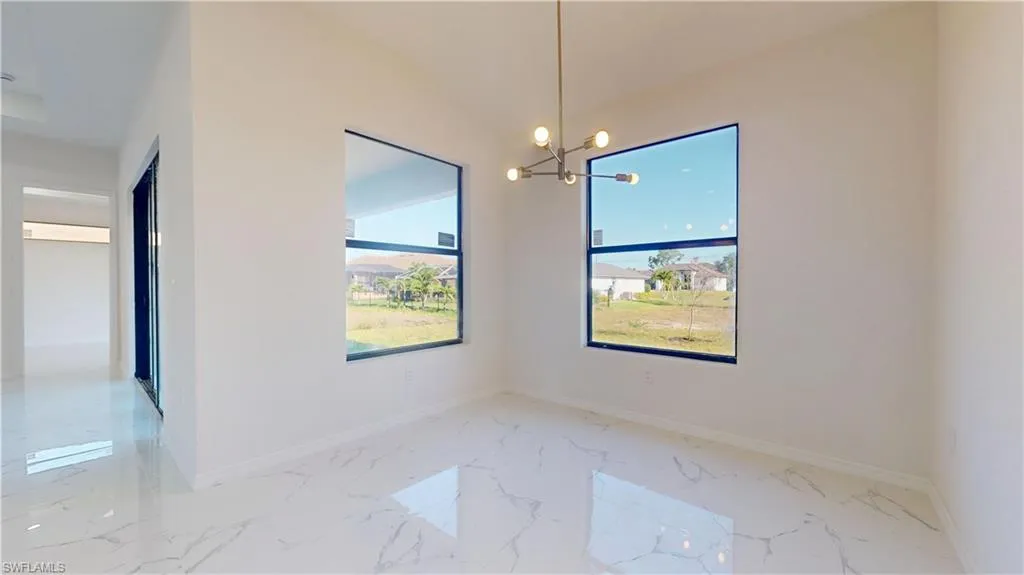 BEST PRICED MODEL HOME IN CAPE CORAL!! This stunning 3-bedroom, 2 Full-bathroom home, complete with a den/office and a 3-car garage, is located in a peaceful residential area that perfectly balances privacy and convenience. Upon entering, you are greeted by a double-door entryway and porcelain tile flooring throughout. The open-concept layout enhances the spacious feel of the home, while the high-end custom kitchen boasts a large island and elegant quartz countertops. The master bedroom features expansive His and Hers walk-in closets, dual sinks, and a separate shower stall. The home is equipped with hurricane-impact windows and doors for added safety. Step outside to a covered terrace, providing plenty of space to create your dream pool. Situated in the heart of Cape Coral, this home is conveniently close to restaurants, schools, and shopping. This property is NOT IN FLOOD ZONE!!!! NO HOA!!!!! Don’t miss this rare opportunity to enjoy space, comfort, and modern convenience all in one place!