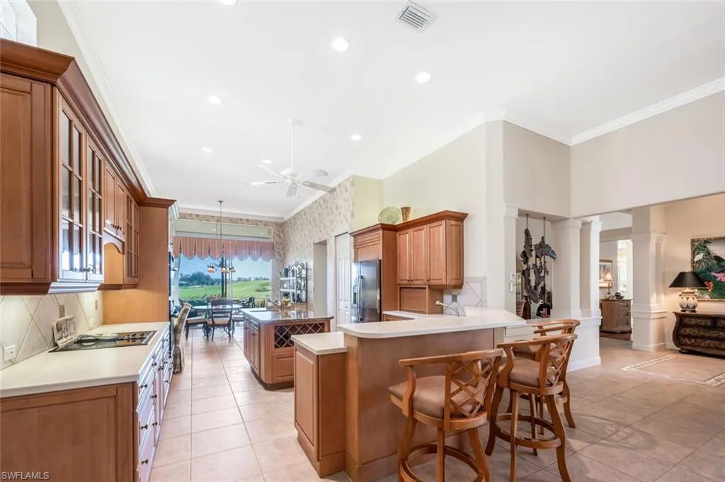 Welcome to the Kensington Community! This Arthur Rutenberg, Viscaya Courtyard Model has a very desirable layout for entertaining and everyday living. This property is in a prime location within walking distance to the Private Membership Club. You get the best of both worlds with a private courtyard pool and hot tub, and an expansive back Lanai with golf course views overlooking the 9th hole. The home features 3 bedrooms + den, 3 full baths with 1 half bath. The serene private guest suite off the courtyard boasts a mini-kitchen and full bathroom for your guests to enjoy. When you walk through the main French Doors you are greeted with golf course views and an open concept Dining and Living room area with access to the Lanai. This kitchen offers a lot of natural light and the Breakfast Bar faces the golf course. The kitchen is designed for storage enthusiasts with plenty of drawers, Built in Cabinets, cooktop, built-in microwave and wall oven. The large island features a prep sink cabinet, and wine storage. Enjoy your breakfast or a snack in the eat-in area with beautiful view and sliders to the Lanai. The Great Room, adjacent to the Kitchen, has transom windows for light, a built-in gas fireplace, a Coffered Ceiling and sliders to the courtyard. The den/office area is spectacular! Located in the back of the house with golf course views and access to the Lanai, it could be used as a 4th sleeping space with the 1/2 bath is just across the way. The Primary Bedroom has wood floors, a sitting area, and a Courtyard Pool view. The Primary Bath has a tranquil feel with a separate tub and walk in tile shower, double sinks with under cabinet lighting and walk in closet. The spacious guest bedroom has courtyard access and is close to the 3rd full bathroom which also can be accessed from the pool area. The in-house laundry room has plenty cabinet storage and easy access from the 2-car garage. The courtyard area has a nice-sized pool and spa with a built-in sink and grill area for entertaining. Improvements to the house include: 2018 Roof, One of the A/C’s units replaced in 2023, One of the HWH’s replaced in 2023. Don’t miss the opportunity to make this house your dream home!