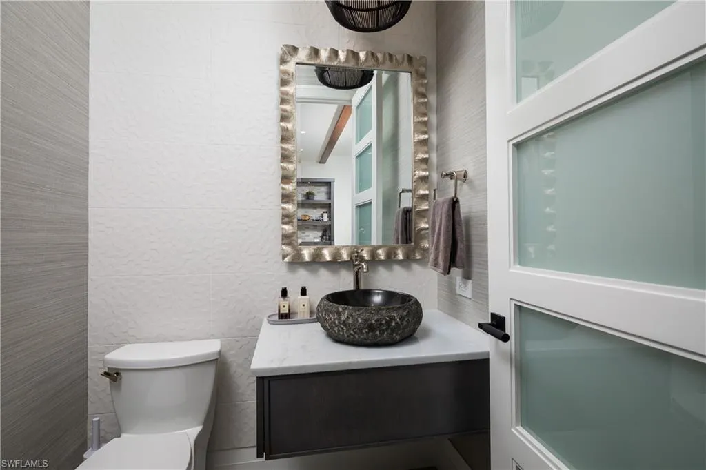 One-of-a-kind masterpiece built in December 2022 (nearly 2023) in the highly sought-after Moorings neighborhood of Naples with breathtaking bay views. Just a 10-minute walk (0.4 miles) to the beach, this architectural marvel offers an unparalleled coastal living experience. As a Moorings resident, you are eligible for membership (at a very low cost) to the exclusive Moorings Beach Park for effortless beach access. This modern estate was custom-built by the award-winning Potter Homes & expertly designed by Adelyn Charles Interior. Designed for the utmost privacy & exclusivity featuring electric motorized entry gates, a solid fortress-like construction of all concrete block, hurricane impact windows/doors throughout & electric hurricane shutters. Every aspect of this property has been crafted with the finest materials & attention to detail, including stunning oak flooring, reverse tray ceilings with wood paneling/uplighting & soaring 14-ft ceilings. Part of the exclusive “Golden 50” in the Moorings, with direct, bridge-free access to the Gulf in just 5 minutes via Doctors Pass. For boating enthusiasts, the home is equipped with dual lifts—one featuring a 30 ft boat lift with a 16,000 lb weight capacity, and the other for dual jet skis. The outdoor living space is a true paradise, with a luxurious pool and spa, fireplace, sun deck with built-in firepit, and a fully equipped summer kitchen perfect for al fresco dining. With 12 ft pocketing floor-to-ceiling sliders, the space effortlessly blends the interior and exterior for seamless waterfront living. Inside, this expansive estate offers 6,900 sq ft under air with 6 bedrooms, 6 full bathrooms (all with dual vanities), 3 half baths, a separate guest house, 3 laundry rooms & a 3-car garage. The state-of-the-art kitchen is a chef’s dream, with custom white cabinetry, dual wood islands with waterfall concrete overlays, high-end Thermador appliances & a butler’s pantry. The main-level primary suite is a private retreat, complete with custom wood ceilings, a wet bar, massive walk-in closets, and a spa-like bathroom with dual vanities, dual water closets, a generous shower with multiple showerheads, dual benches & a separate soaking tub. Upstairs, a spacious living room area with a wet bar, island with bar seating & 3 bedrooms create the perfect space for relaxation, while a sundeck provides breathtaking water views. For ultimate guest privacy, the separate guest villa offers a bedroom, ensuite bathroom, laundry room, full kitchen & private sundeck—ideal for hosting guests. Another highlight of this home is the rooftop observation deck offering sweeping views of the Gulf & Bay—perfect for sunset vistas. Additional features include a private elevator, buried gas propane tank, electric screens, lush landscaping, a spacious front yard ideal for pets & more. An extraordinary sanctuary in one of Naples’ most coveted communities, The Moorings, this residence is truly a showcase of visionary design.