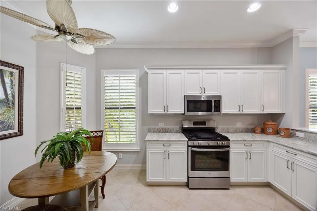 The spacious layout includes a generous master suite, formal and casual dining areas, and a contemporary kitchen featuring upgraded white cabinetry with soft-close drawers, granite countertops, and stainless-steel appliances. Thoughtful design details throughout the home include a soaring 12-foot double tray ceiling in the main living area, crown molding, plantation shutters, eight-foot interior doors, elegant lighting fixtures, and ceiling fans. Flooring includes diagonally set tile in the main living areas and rich wood floors in the second and third bedrooms.