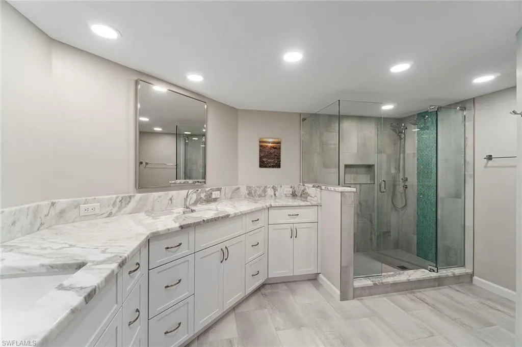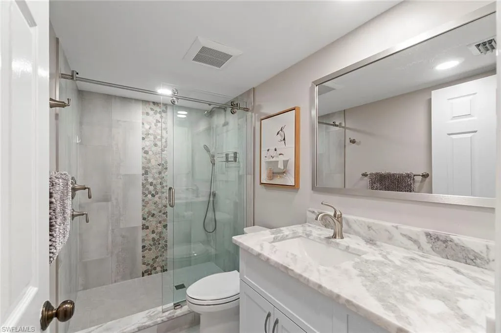 Welcome to this beautifully updated 2-bedroom, 2-bath residence in the desirable Sandpiper neighborhood of Bonita Bay. This second-floor condominium combines modern upgrades with serene lake and nature views, creating the perfect blend of comfort and style. Step inside to discover an inviting open floor plan highlighted by modern tile flooring, plush carpeting, and abundant natural light. The fully remodeled kitchen (2022) features white shaker cabinets with soft-close drawers, granite countertops, stainless steel appliances, under-cabinet lighting, a breakfast bar, and an eat-in nook beneath a tray ceiling with recessed lighting—ideal for casual dining or entertaining. The spacious primary suite offers peaceful pond views and direct access to the screened lanai which is complete with new no-see-um screens. The remodeled ensuite bath showcases dual sinks with granite countertops, white soft-close cabinetry, walk-in tile shower with multiple showerheads, and a large walk-in closet. The separate guest suite and second bath are equally impressive, providing comfort and privacy for visitors. Enjoy tranquil mornings and colorful sunrises from the lanai, framed by lush trees, manicured landscaping, and a sparkling pond—offering a private and picturesque backdrop with no neighboring residences in view. Additional highlights include 2023 A/C, 2023 new condominium roof, covered carport parking, outdoor storage, and ample guest parking, all in a convenient location, just two buildings down from the community pool and tennis courts. Residents of Bonita Bay also enjoy access to a private beach park on the Gulf, scenic walking and biking trails, multiple parks, and a full-service marina—with optional club membership for world-class golf, dining, fitness, and spa amenities. Experience the peaceful charm and exceptional value of Lake Forest living.