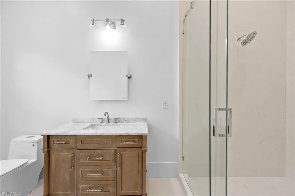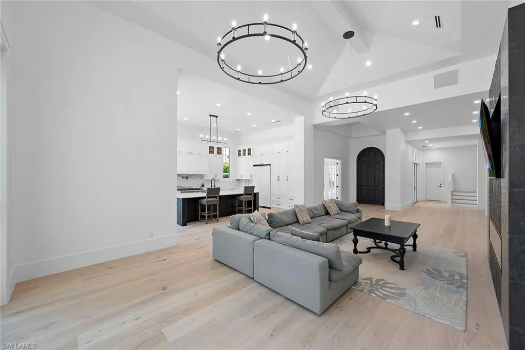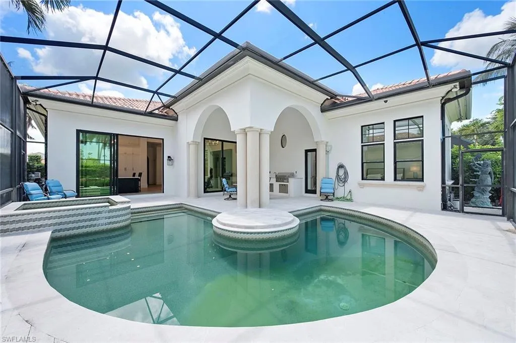 Nestled within the prestigious Tiburon community, this 5-bedroom, 4.5-bathroom estate has been completely renovated for open-concept living, blending modern elegance with timeless sophistication. Thoughtfully curated finishes and designer details elevate every space, creating an inviting yet luxurious atmosphere. New White Oak hardwood floors flow seamlessly throughout, enhancing the open and airy feel. The custom-designed kitchen is a chef’s dream, featuring Décor cabinetry, luxury appliances, and Quartzite countertops, ideal for both everyday living and entertaining. New Marvin impact windows and sliders not only enhance the home’s beauty but also provide superior insulation, allowing for a peaceful and quiet indoor retreat. Step into spa-like serenity in the fully renovated primary bath, where a frameless glass walk-in shower with floor-to-ceiling natural stone, a sculptural free-standing tub, and a custom double vanity with high-end cabinetry create a tranquil retreat. Every detail is designed for beauty, function, and relaxation. The outdoor living space is equally impressive, featuring a private heated pool and spa, a newly finished pool surround, and a fully equipped outdoor kitchen with a brand-new grill—perfect for entertaining. A generous backyard retreat offers serene fountain views, providing a peaceful setting for morning coffee or evening gatherings. A private guest cabana ensures a comfortable, stylish space for family and friends. Located in one of Naples’ most sought-after enclaves, this home offers access to world-class golf, resort-style amenities, and the unparalleled service of The Ritz-Carlton. This is a rare opportunity to own a fully reimagined luxury home in the heart of Tiburon.