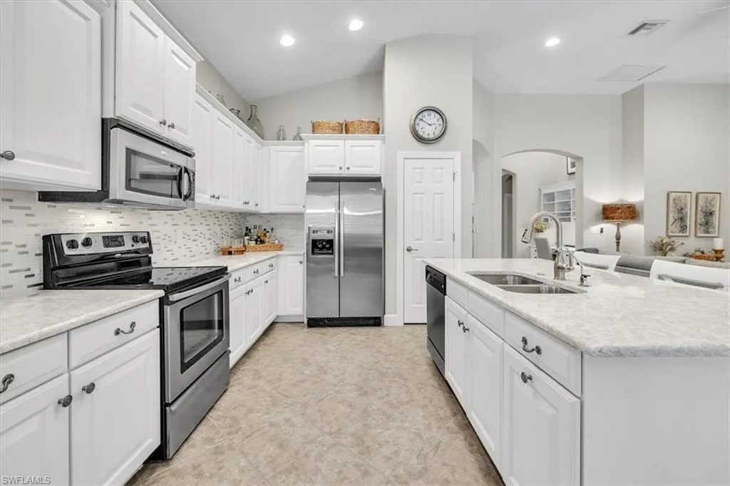 Step inside to a freshly painted interior where soft coastal tones, new plantation shutters from Metro Blinds ($10K), and professionally curated décor ($5K) create an atmosphere of calm sophistication. The open-concept living space flows into a newly upgraded chef’s kitchen, featuring a stunning quartz counter-height island and backsplash ($12K) — the perfect place to entertain or enjoy casual meals.