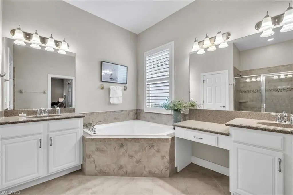 The primary suite is a true retreat, featuring new furniture ($26K investment across the home), a serene sitting area, and a spa-inspired bath with a soaking tub and walk-in shower. A dedicated built-in office station offers an ideal work-from-home setup. Every detail has been refreshed, from professionally cleaned tile grout to leveled and sealed driveway pavers.