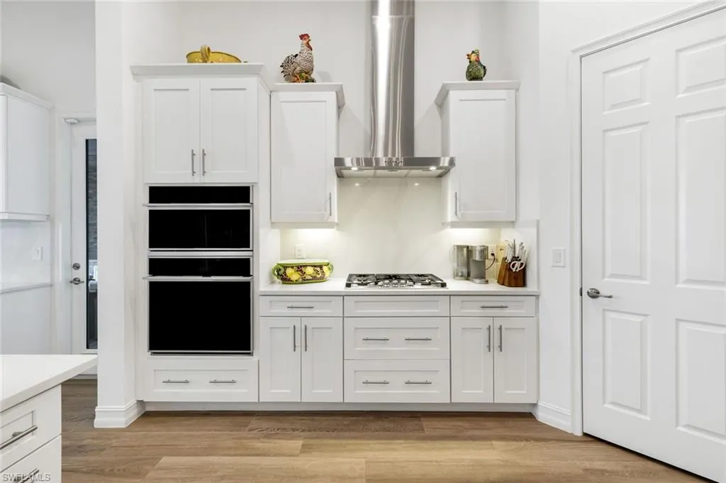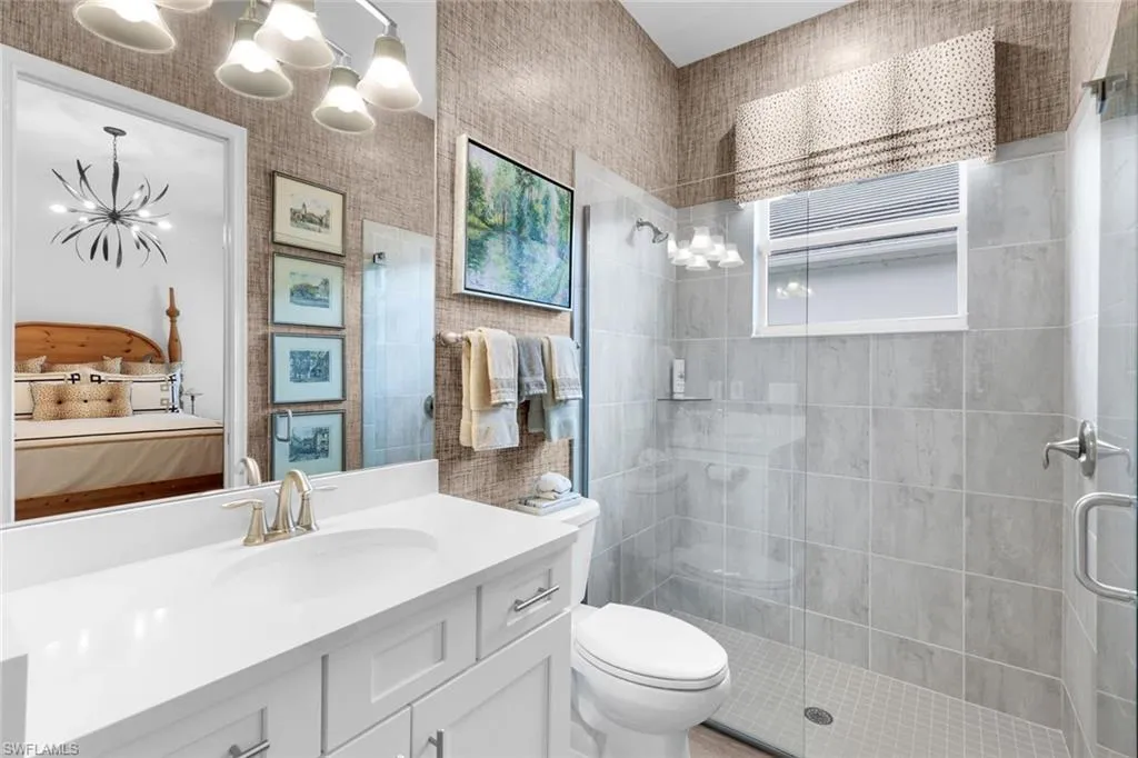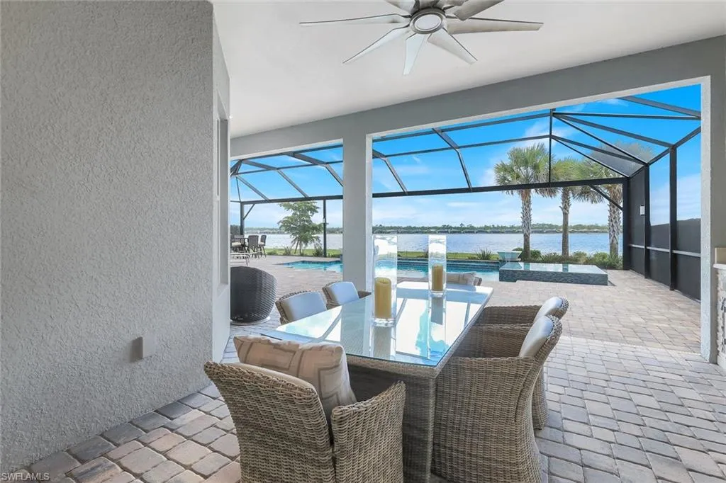“Simplistic elegance” are words used by the seller to describe this 3 bedroom 3 bathroom, 3 car garage waterfront home. The magnificent “Bougainvillea Model” is a true masterpiece. The floorplan flows smoothly through the exquisite upgrades. From the tankless water heater to the RO system in the kitchen which also connects to the refrigerator, just a part of the GE Monogram appliance package. The entire home has wood-like tile flooring. Great room has built in cabinets that house the TV that ascends and descends with the push of a button. Upgraded light fixtures throughout from Hubbardton and Forge or the Lamp Shop of Naples. Main suite has view of the lake and pool, two walk in closets, double sink vanity and shower with large seat, 1 of 2 toto double flush smart toilets. The 9 bladed paddle fans on the lanai also run on remote control and keep it cool by the outdoor kitchen. You often hear, this one is a must see, but this time its true. Looks better than the pictures. The views are incredible! Room for a dock if so desired. Has an ADT Security System, high ceilings and world class amenities.