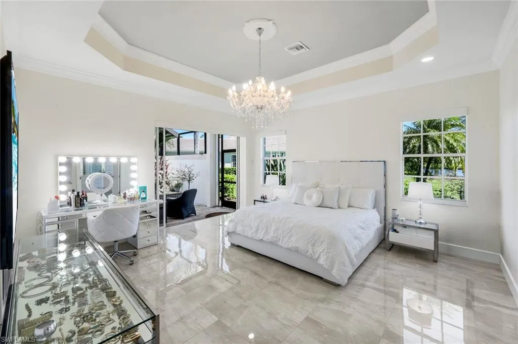 YOUR PRIMARY SUITE IS A SANCTUARY WITHIN A SANCTUARY-complete with a spa-inspired bath featuring a freestanding soaking tub, frameless glass shower, Cristallo countertops, and a custom walk-in closet with elegant built-ins. Even the lighting feels curated, with chandeliers that sparkle like fine jewelry, casting a warm, sophisticated glow over each room.