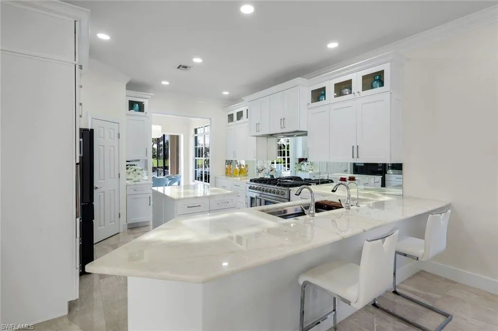 The OPEN-CONCEPT GREAT ROOM AND DINING AREA are lined with glass, framing breathtaking views of the lake and golf course THE CHEF’S KITCHEN IS A WORK OF ART-crafted for both form and function—with under-lit Cristallo quartzite countertops, custom white cabinetry, designer fixtures, and a professional-grade 48” Forno gas range & griddle.