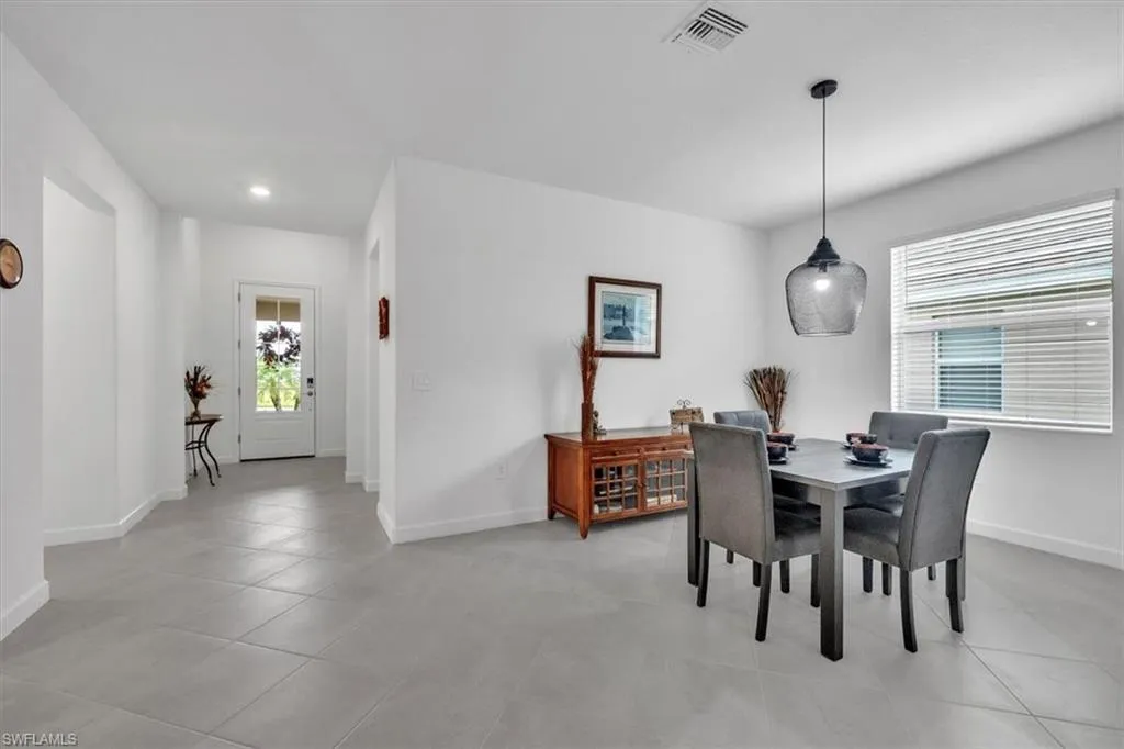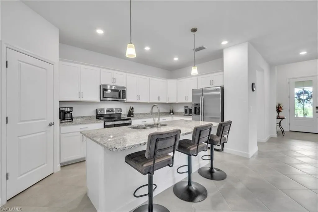 Step inside this thoughtfully designed Lennar (Venice) home spanning approximately 1,852 square feet of open-concept living space. The foyer welcomes you with soaring ceilings and an abundance of natural light, flowing seamlessly into the expansive great room, where the well-equipped kitchen—boasting granite countertops, stainless steel appliances, a large island with breakfast bar, and ample white cabinetry—overlooks the inviting family and dining areas. Perfect for gatherings, the layout promotes effortless indoor-outdoor connectivity through sliders leading to your private lanai. The grout has just been professionally cleaned, tinted, and sealed.