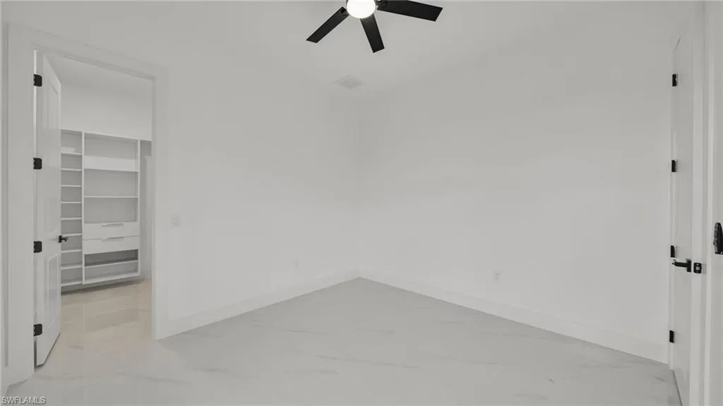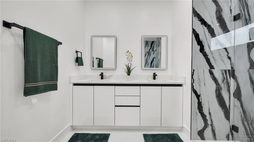 The master suite feels like a private spa retreat, featuring a striking zebra-inspired tile design in the oversized walk-in shower, a soaking tub, dual vanities, and a spacious walk-in closet. Every detail is crafted for relaxation and luxury.