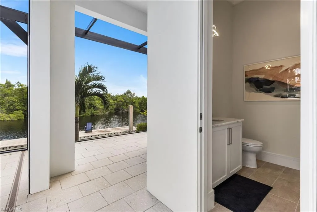 Step outside to your massive covered lanai with tongue-and-groove ceilings, a sparkling turquoise salt water pool, a fully equipped outdoor kitchen (Sedona grill, refrigerator, sink), fire pit, outdoor shower, and pool bath—perfect for entertaining year-round. An 80-ft floating concrete dock is ready for your boat and water toys and can accomodate a yacht up to 100 ft.