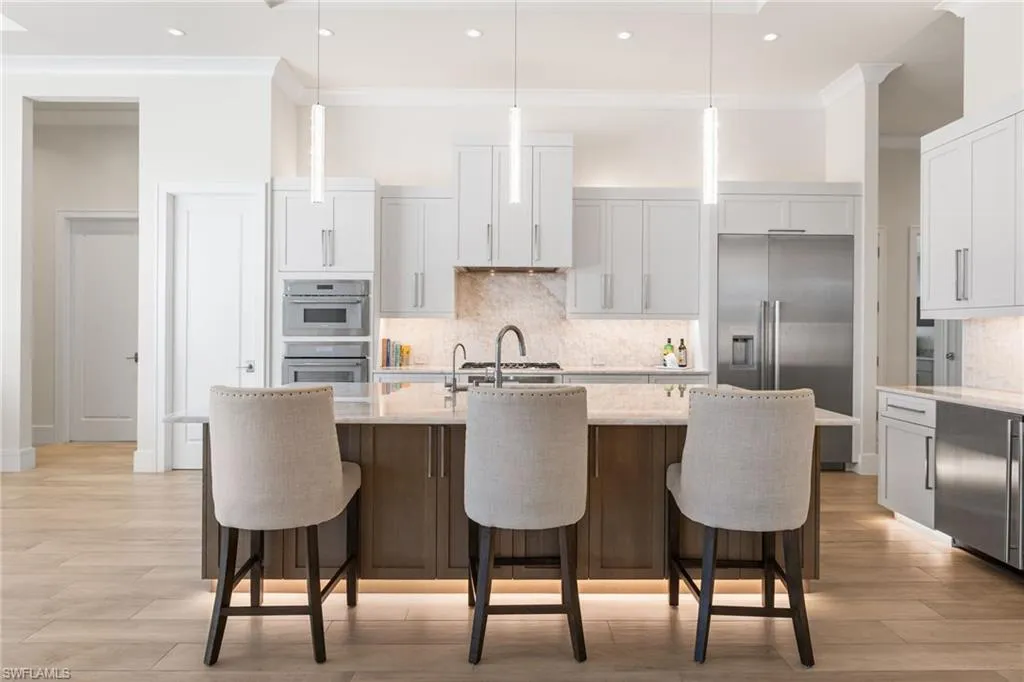 The open-concept chef’s kitchen is a dream come true, featuring a massive quartz island, Thermador appliances, a morning kitchen with a second refrigerator and wine cooler, and abundant space for entertaining. The formal dining room overlooks the water, adding to the home’s sophisticated layout.