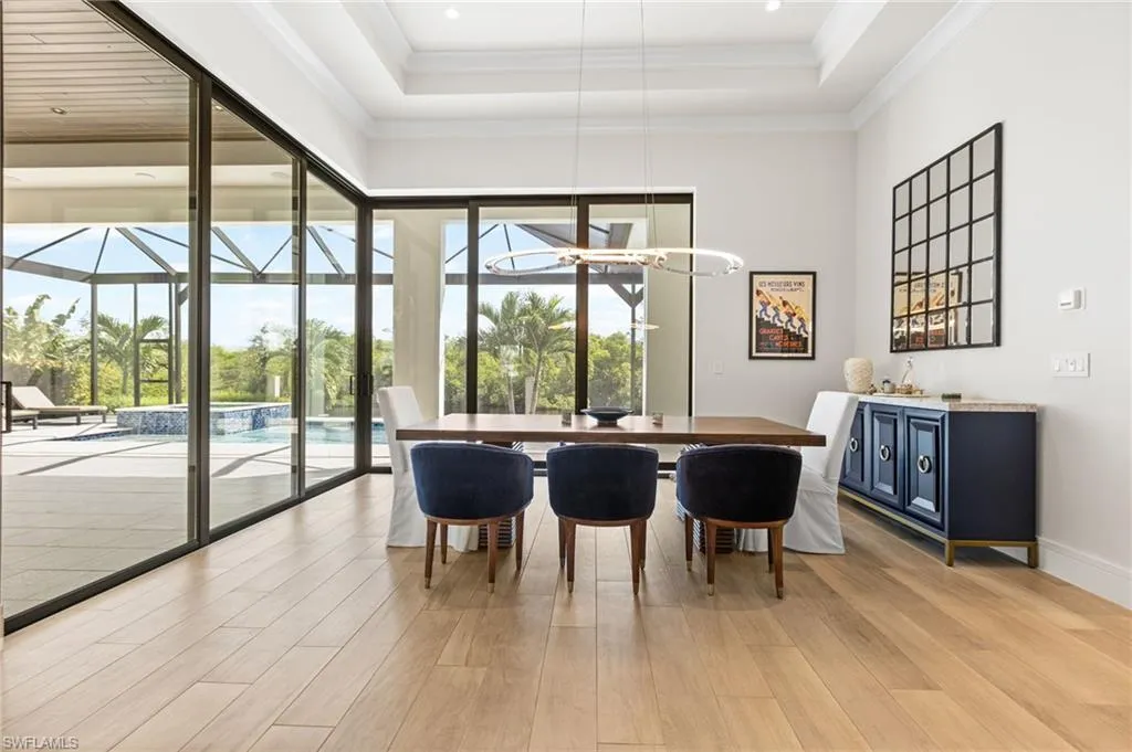 Boasting over 3,700 sq ft of refined living space, this home seamlessly blends modern design with timeless elegance. Soaring ceilings with exposed wood beams create a grand ambiance in the main living area, while a 12-foot wall of sliding glass doors brings the outdoors in, offering panoramic views of lush mangroves and tranquil water.