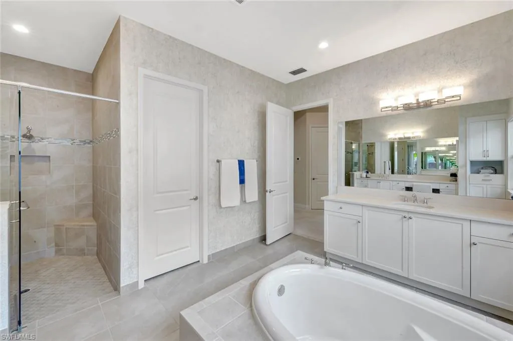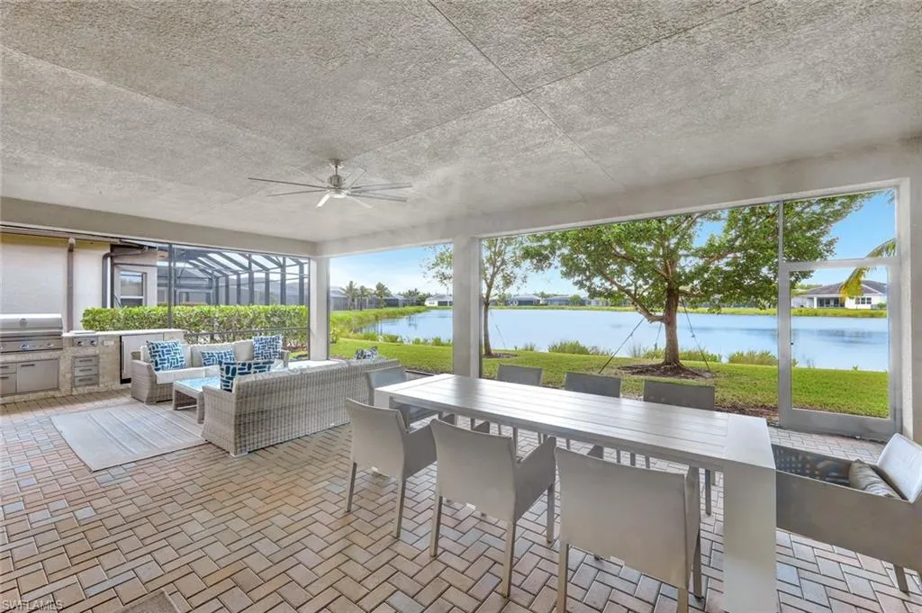 Fantastic News! A “NAPA” floor plan is available! This top selling floor plan for GL Homes is located in Valencia Bonita, a 55+ Active Adult manned gated community which provides resort living at its best. As you enter the home through the upgraded glass front doors, the first thing you notice is one of the best lake views in the community. This view on the largest lake, is really appreciated when relaxing or entertaining on the oversized covered back patio watching the beautiful sunset. The home site is in close proximity to the clubhouse amenities where you have access to all the resort amenities, including the 45,000 sq. ft. clubhouse with indoor and outdoor restaurants, bars, many pools & much more. This desired floor plan was designed to offer a bright open great room concept with four bedrooms each with their own private bathrooms plus a versatile den along with a half bath and a spacious 3-car epoxied floored garage. This well appointed home with many upgrades and striking designer chandeliers provides the ultimate Florida lifestyle. Highlights include a custom outdoor kitchen with a four season outdoor refrigerator, impact glass, custom built-ins in the den & dining area, providing pull out lower drawers, quartz countertop with wine chiller, upgraded 17” tile flooring in main living area and den, large walk-in customize closets in the primary bedroom along with new carpeting and motorized shades on all windows. The gourmet kitchen boasts upgraded appliances with a BOSCH natural gas range, upgraded sparkling quartz countertops, 42” upper white wood cabinetry with above & undercabinet lighting, along with molding and valence on cabinets, pull out base drawers along with upper glass cabinet fronts with lighting & a large cabinet pantry. Also provided is a large single bowl stainless steel undermount sink with a modernized chrome faucet and expanded overhead LED lighting. The primary suite bathroom offers dual vanities, white wood raised panel cabinets, quartz countertops, large walk-in shower, soaking tub, a custom cabinet linen closet & builder upgraded tile package for flooring and shower walls. All other bathrooms come appointed with quartz countertops, white wood raised panel cabinets, banjo feature on senior height toilets and builder upgraded tile packages. Valencia Bonita is a top selling Active Adult 55+ community in Bonita Springs with a spectacular clubhouse and amenities! The clubhouse is located on a 10-acre complex offering a resort style swimming pool, 60 ft. lap swimming pool, resistance exercise pool, grandchildren wading pool, racket center pro shop, tennis courts, pickelball courts, bocce courts, dog park & fire pit. Residents also enjoy performances and social events in the grand ballroom, fully equipped fitness center, spa with treatment rooms & nail salon, restaurant with indoor and outdoor bars, card rooms, sports lounge, arts and crafts room, yoga/exercise, studio, ping-pong, massage rooms & so much more!