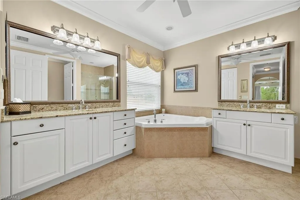Upstairs, you’ll find four additional bedrooms, two full baths, and loft area for an office or extra room. Also included is the master bedroom suite with a sitting area overlooking the preserve. The primary suite offers two oversized walk-in closets with built-ins, a spa-like bathroom with dual vanities, a soaking tub, a frameless walk-in shower, and crown molding for a touch of elegance.
