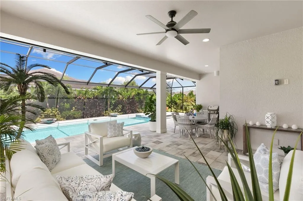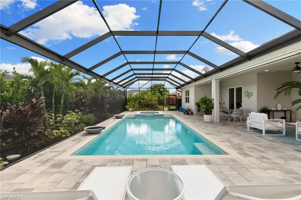 Discover your tropical retreat in Naples Reserve’s coveted Canoe Landing. This stunning Stock Development home sits on a beautifully landscaped corner lot and showcases over $220k in builder upgrades. Enjoy your own private paradise with an oversized resort-style pool (14 X 29) and spa (6 X 6), surrounded by botanical garden-style landscaping and breathtaking long lake sunset views. Additional highlights include: Storm smart screens, garage mini split system, plantation shutters, custom family room built-in with fireplace, custom closets, a coffee bar in walk-in pantry and overhead storage racks in the garage. All this is found within Naples’ premier resort community, offering an exceptional lifestyle of beauty, privacy, and relaxation. *NO FLOOD INSURANCE REQUIRED-LOMR on record!