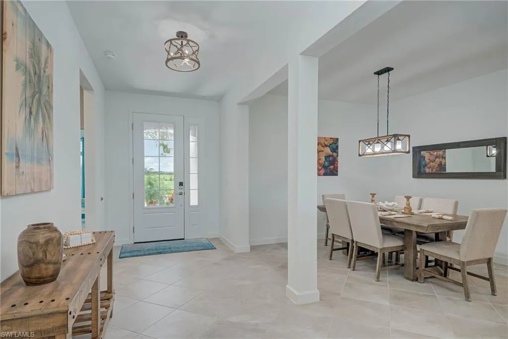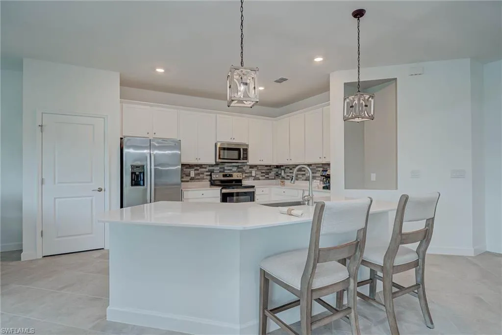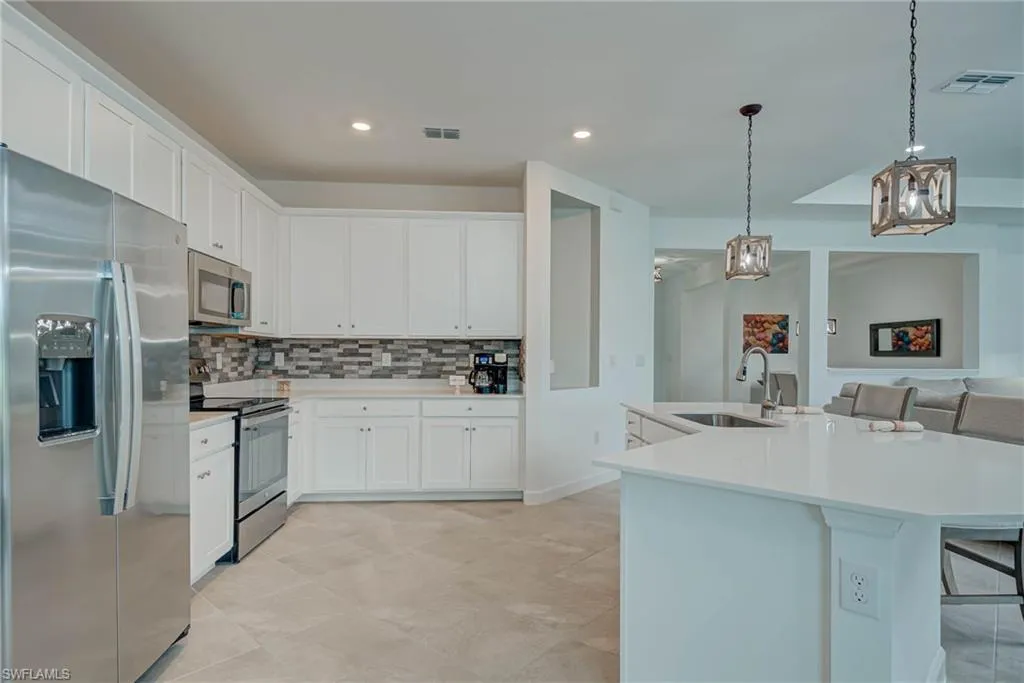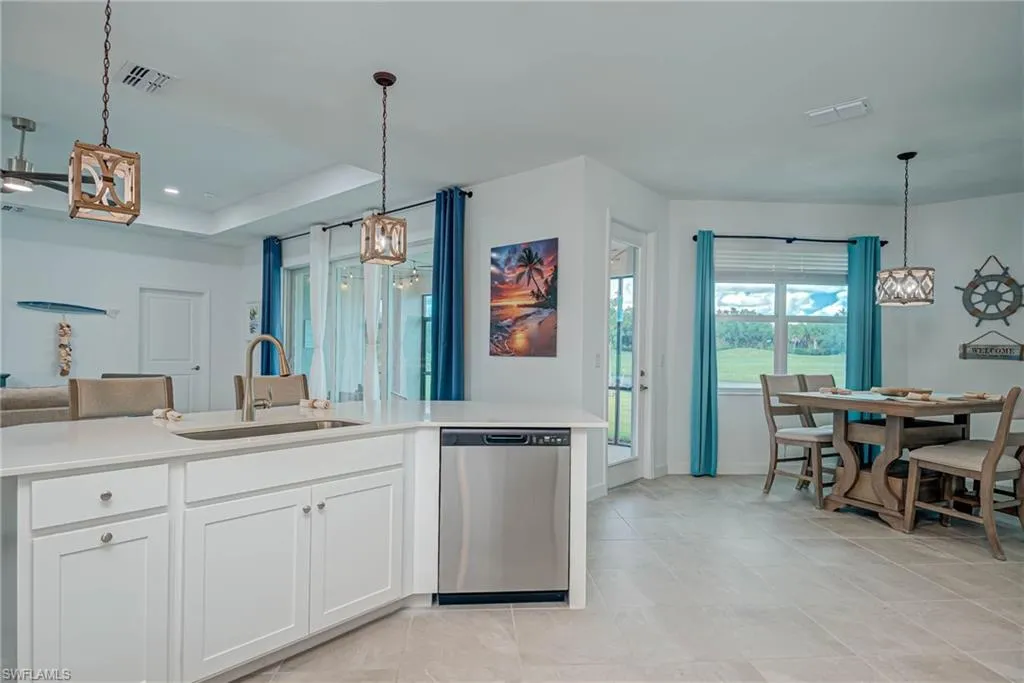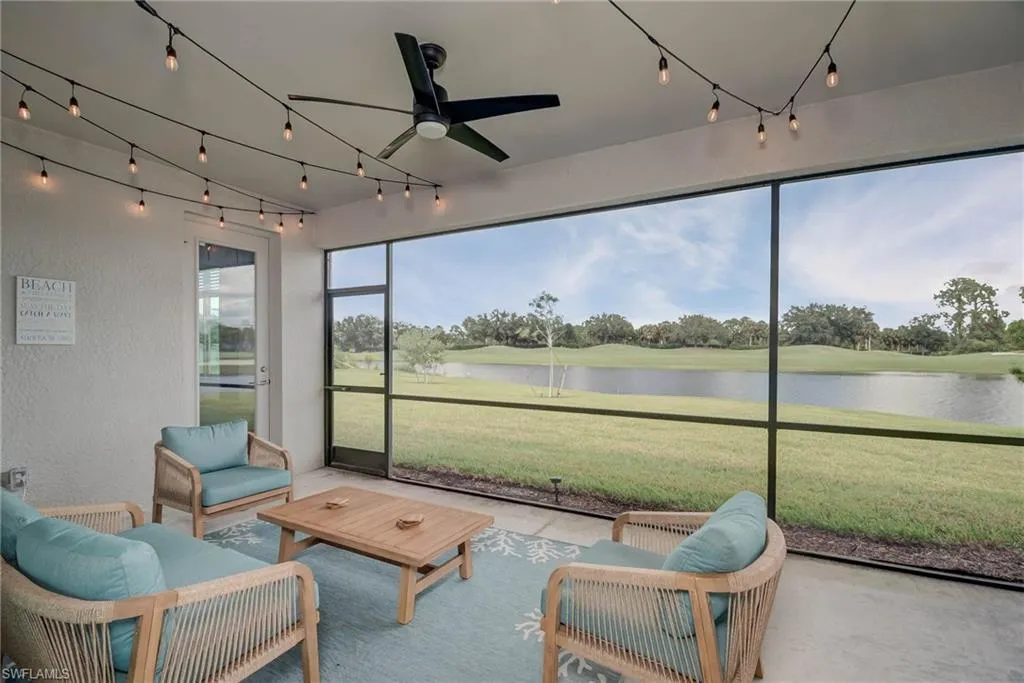 Why wait to build and then have to furnish, when you can move right into this like new, lavishly decorated, Turnkey home ?! FABULOUS WATERFRONT LOCATION WITH UNPARALLELED GOLF COURSE VIEWS OF 18TH HOLE! 360 STUNNING VIEWS FROM EVERY WINDOW AND LIVING ROOM WALL OF SLIDERS! This home features 4 bedrooms, 2 full baths and a three car garage, Upgrades include gourmet kitchen with extra large counter height island with Quartz countertops, coveted white cabinets, subway tile backsplash, stainless appliances, large tile laid on the diagonall throughout. HURRICANE IMPACT GLASS AND SLIDERS FOR ADDED PEACE OF MIND.Amenities include Championship golf course designed by Gordon Lewis III, the course is known for its challenging design with the highest elevated green in Fort Myers and panoramic views of the surrounding area. Resort style pool, meticulously maintained Tennis and Pickleball courts are sure to impress. All of this and UNLIMITED GOLF MEMBERSHIP INCLUDED!