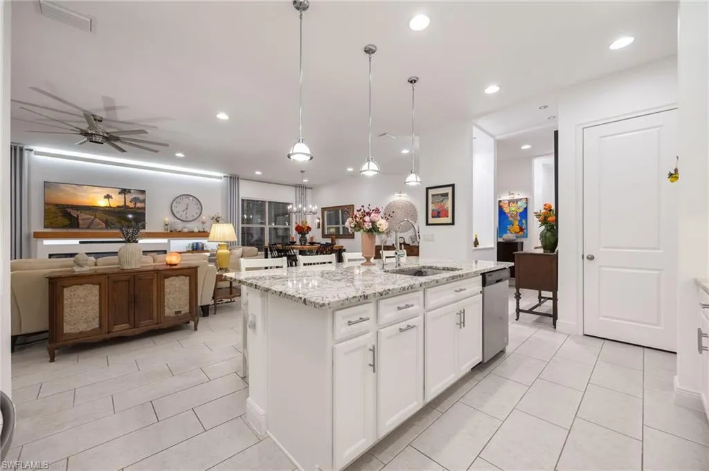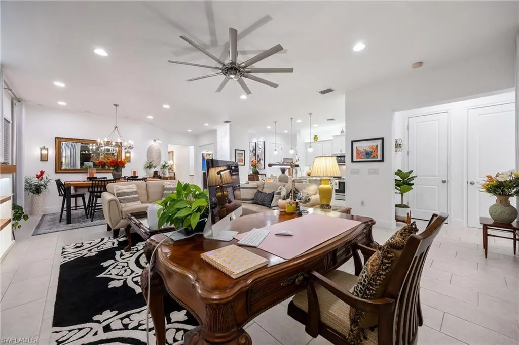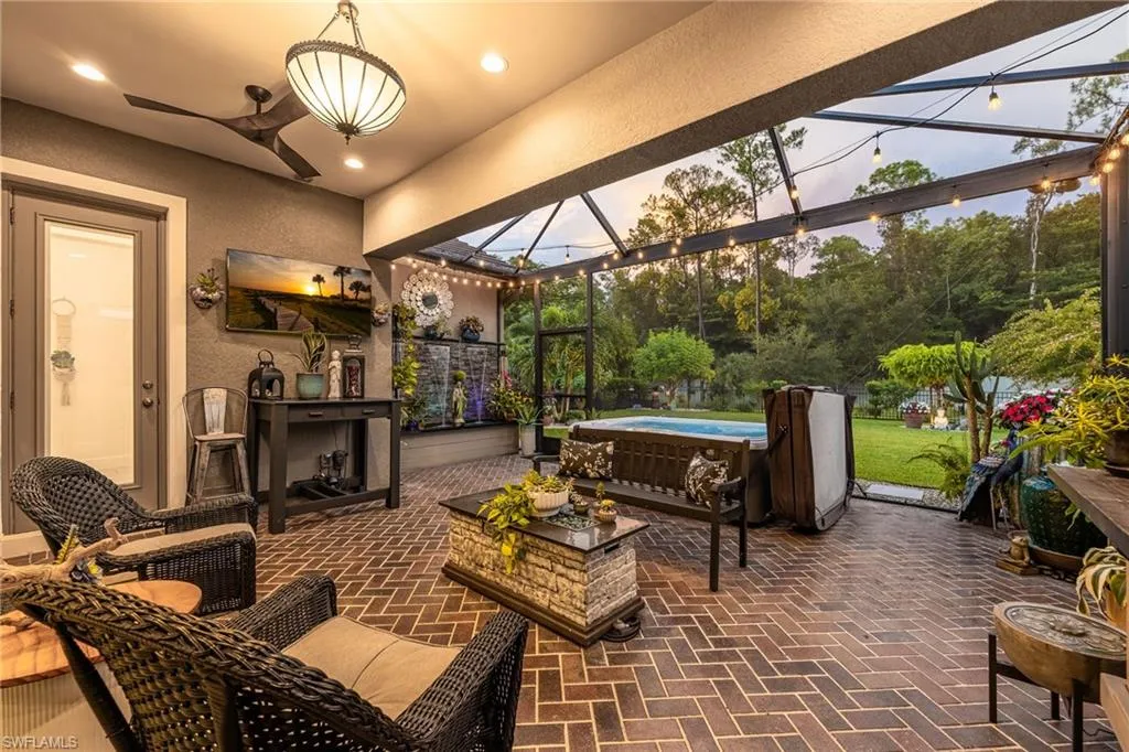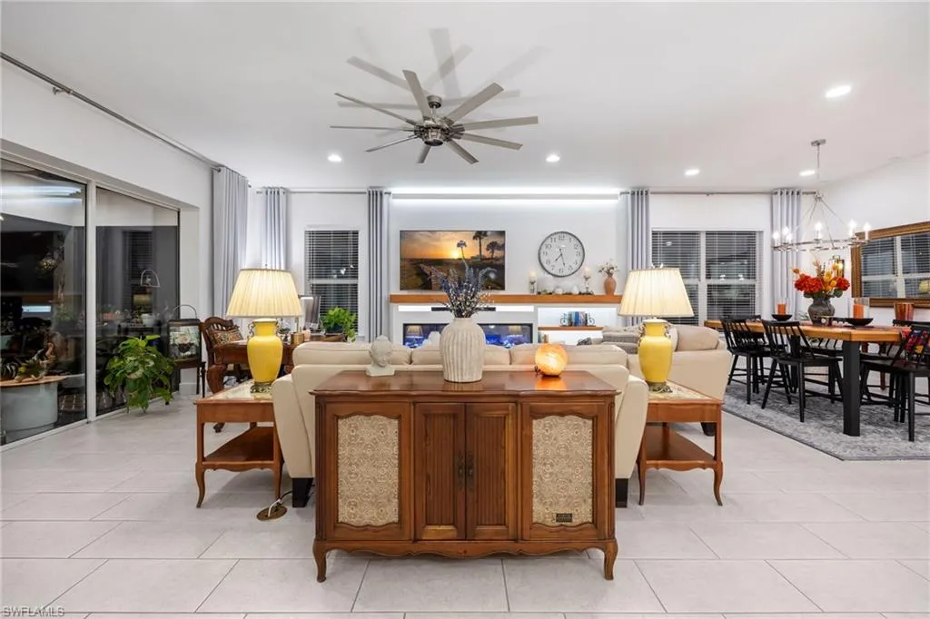 Spanning 2,422 square feet, this 3-bedroom plus office residence showcases thoughtful upgrades both inside and out. Every room has been expertly designed and beautifully finished, featuring designer light fixtures, elegant window treatments, a custom fireplace with built-ins, and an extended screened lanai complete with a relaxing hot tub and breathtaking landscape lighting that transforms the outdoor space into a private retreat.