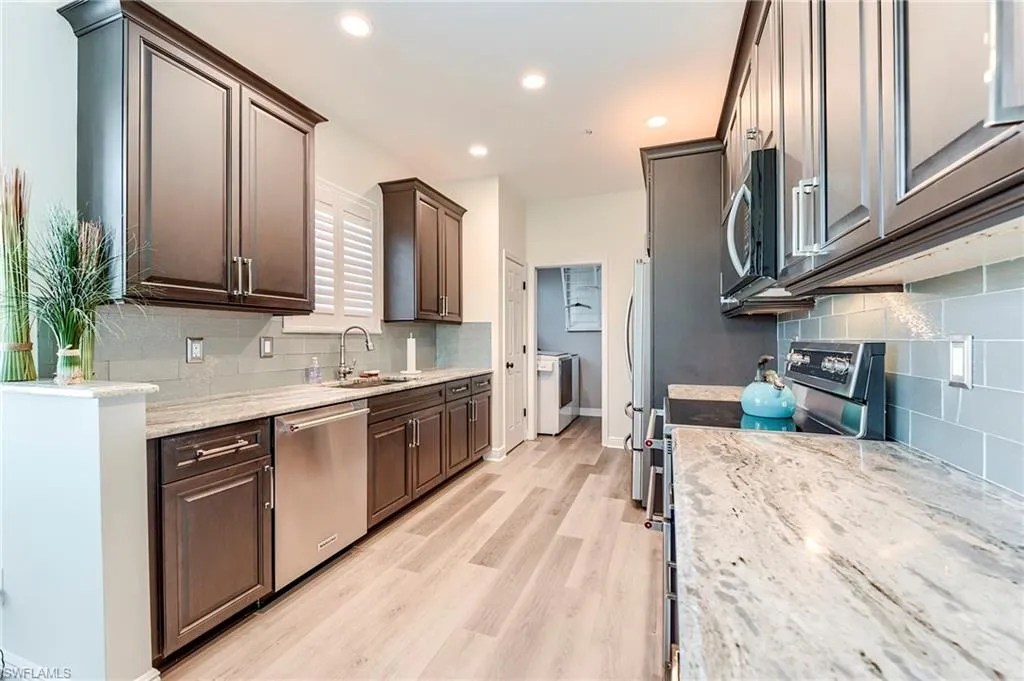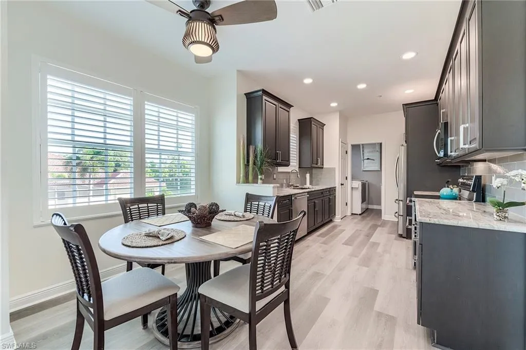 COMPLETELY UPDATED and Turnkey Furnished carriage-style home in the desirable gated community of Bell Tower Park in Fort Myers. This spacious 4-bedroom, 3-bath residence offers over 2,300 square feet of beautifully designed living space, blending comfort, elegance, and modern upgrades. The bright, open floor plan showcases a kitchen with ample cabinetry, quartz countertops, double oven, subway tile backspalsh with a modern twist and breakfast nook—perfect for entertaining. The living and dining areas flow seamlessly to the expansive screened lanai, where you can relax or dine al fresco while enjoying tranquil lake views. The primary suite with private access to lanai is a luxurious retreat featuring a spa-like bath with a glass-enclosed shower, dual vanities, and sophisticated finishes. Additional highlights include impact-resistant windows and doors, designer lighting, plantation shutters, and wood-look flooring throughout. Located within minutes of shopping, dining, and entertainment at Bell Tower Shops, as well as RSW Airport and Fort Myers’ beautiful beaches, this home offers the perfect combination of luxury, convenience, and relaxed Florida living.
