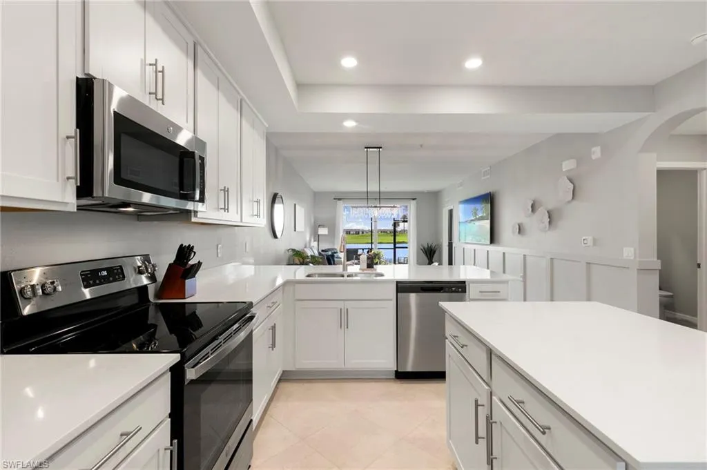 Step inside to discover an open-concept living space filled with natural light, sleek finishes, and contemporary touches throughout. The stylish kitchen features stainless steel appliances, quartz countertops, and a spacious breakfast bar that flows seamlessly into the dining and living areas — ideal for entertaining or relaxing after a day on the course.The primary suite offers a peaceful retreat with two closets and a spa-inspired ensuite bath, while the second bedroom provides the perfect setup for guests or a home office. Enjoy your morning coffee or evening cocktails on the private screened lanai, overlooking breathtaking lake and golf course views.