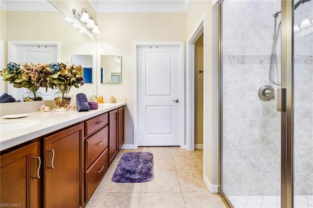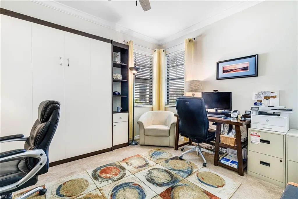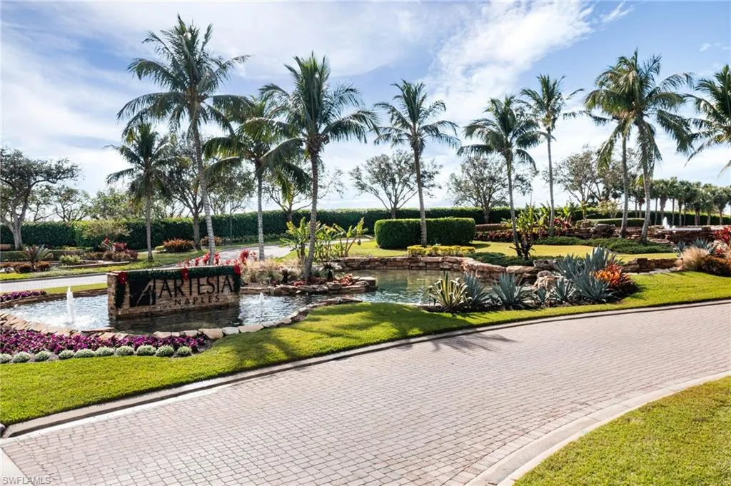 Welcome to your dream home at 1511 Oceania Drive South in Artesia. The gated community offers resort style living, with low HOA fees, including lawn maintenance, cable and internet/Wi-Fi, and NO CDD! This stunning, WCI built, meticulously maintained 2-bedroom plus a den, 2-bath villa offers the perfect blend of luxury, comfort and convenience that includes the highly sought after extended living room and a large extra depth 2-car garage. Step inside and be captivated by the open-concept layout, featuring ceramic tile flooring complemented by the freshly painted Sherwin Williams “Coastal Cool” color palette. Enjoy the tranquil West-facing spectacular sunset lake view from the spacious over 500 s/f lanai added in 2023, featuring a picture window cage and upgraded 20/20 no-see-um screens. The lanai features a jacuzzi hot tub, ceiling fan, Clear Choice electric roll down impact screen offering peace of mind during any season and cable TV, water and electric outlets. The home is protected by premium “hurricane-impact” rated windows and double sliders using tempered, high efficiency, laminated insulated low-e glass. The impact front entry door, with glass insert and hide away phantom screen door, welcomes you and your guests to your dream home. Once inside you will find many recently completed high-end upgrades, including ceramic tile, wide crown moldings throughout, stainless appliances, granite counter-tops, custom glass tile back splash, under cabinet lighting, impact windows and sliding doors, and a monitored security system. The den features glass French doors and easily converts to a 3rd bedroom to accommodate extra guests with an included Murphy bed. The laundry area has a newer washer and dryer, including a convenient countertop with a stainless sink, tile backsplash and an abundance of storage cabinetry. Additional highlights include LED landscape lighting, new irrigation equipment with extra zones, an HVAC Carrier heat-pump system, including an Ultra-violet air purification system that ensures modern comfort, Moen and Kohler fixtures and a built-in TAEXX pest control system. The private primary suite includes double sliding impact doors leading out to the covered lanai, an en-suite bathroom with double sink vanity, Corian countertop, euro glass shower enclosure, discreet water closet, and an expansive walk-in closet. Artesia amenities include a clubhouse with a resort-style pool, pickleball and bocce courts, fitness center, library, theater, 2 dog parks and more—all just minutes from the restaurants and nightlife of 5th Avenue downtown Naples, Marco Island and the pristine Gulf beaches. This is a MUST SEE – Schedule your private showing today!