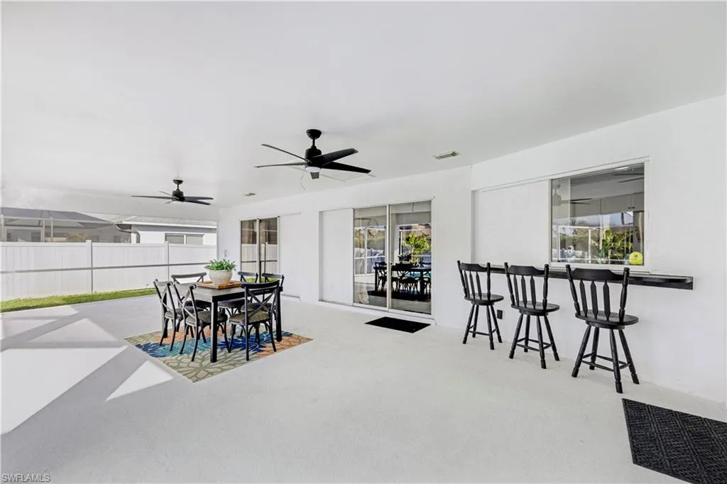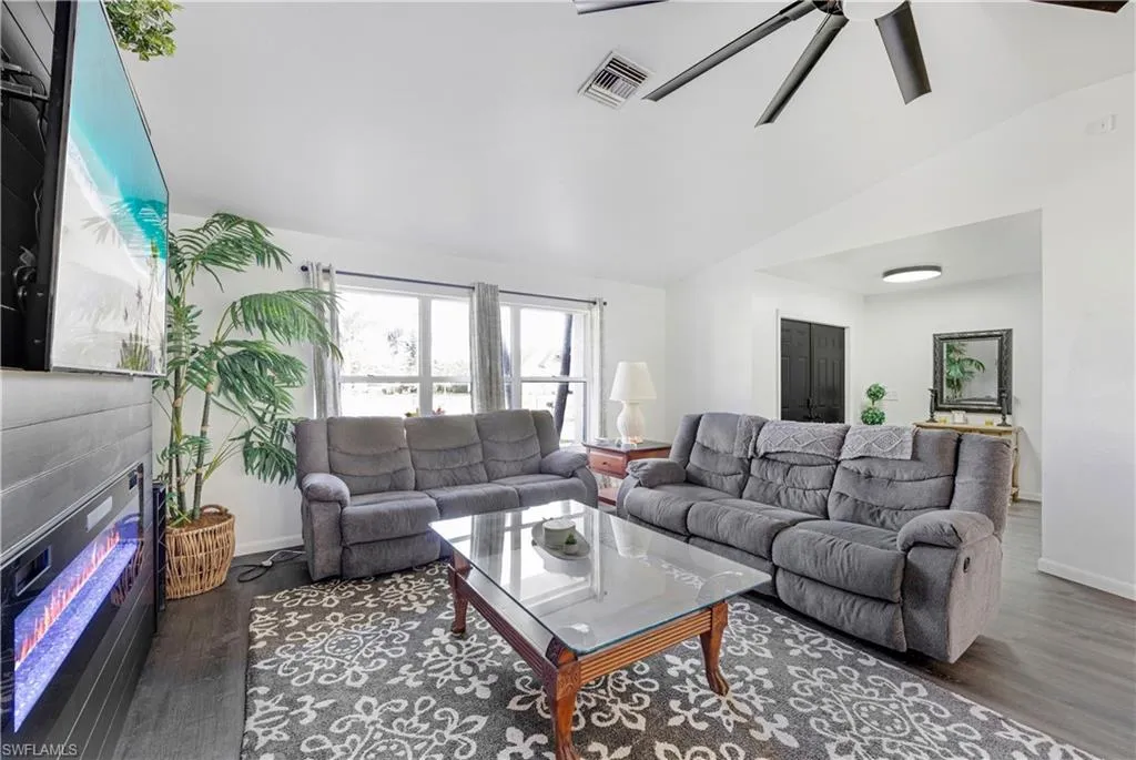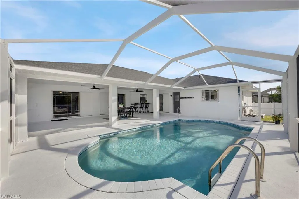 Welcome to your tropical retreat in the heart of Southwest Cape Coral. This stunning pool home has been completely remodeled from top to bottom, and the sellers have even added a brand new pool cage for you to enjoy from day one. Step inside and feel the warmth of the open living area, featuring a built-in electric fireplace and beautiful views of your private pool oasis. The kitchen is a showstopper with quartz countertops, new cabinetry, a farmhouse sink, stainless steel appliances, and a convenient pass through window to your pool bar, perfect for entertaining guests. The primary suite offers direct access to the pool area through sliding doors, along with his and hers walk-in closets and a gorgeous updated bathroom featuring dual sinks and a walk-in shower designed for relaxation. The home also includes a versatile den that can serve as a guest room, home office, gym, or media space. Each guest bedroom has its own walk-in closet and plenty of natural light. Step outside to your massive screened patio and pool area, ideal for hosting gatherings or simply soaking up the sun. With desirable southern rear exposure, you’ll enjoy sunshine throughout most of the day. The roof was replaced in 2021 and remains in excellent condition. This home truly offers the best of Florida living, combining comfort, style, and value in one incredible package. It is completely move-in ready and priced to sell quickly. Don’t wait to make this tropical pool home yours—schedule your private showing today.