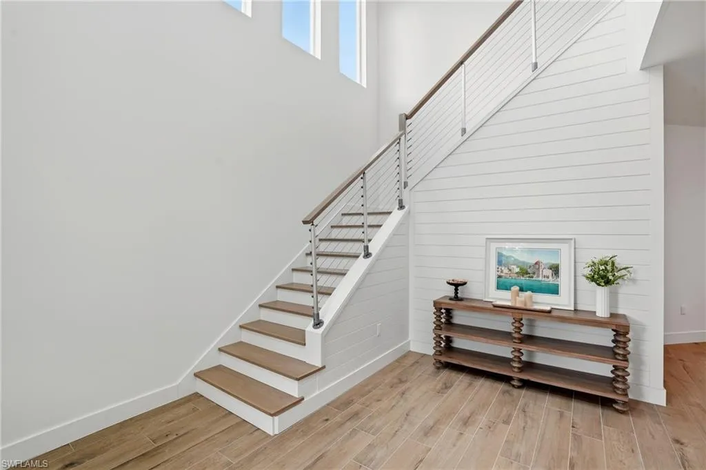 Inside, the open layout showcases a chef’s kitchen with quartz countertops, premium appliances, farmhouse sink, spacious butler’s pantry, and custom cabinetry extending to the ceiling. The living and dining areas feature soaring cathedral ceilings that flood the home with natural light and open to the oversized lanai with heated pool and spa, accented by an extended custom pool tile backsplash. The first-floor primary suite includes lanai access, dual custom closets, and a spa-inspired bath with quartz vanities and walk-in shower. Upstairs, two guest suites each offer private baths, and a central loft opens to a large balcony overlooking the golf course and lake. Additional features include a custom staircase with cable railing, tongue-and-groove wood features in the foyer and outdoor spaces, epoxy-finished garage floors, and impact-resistant windows and doors throughout. As an added bonus, this home is being offered turnkey, which ensures a seamless and stress free transition to Naples living.