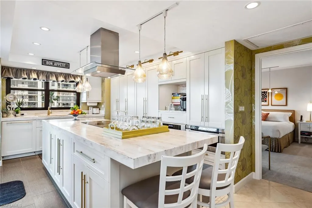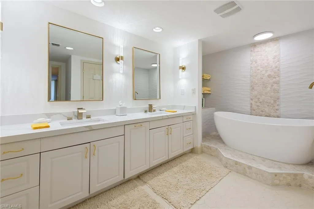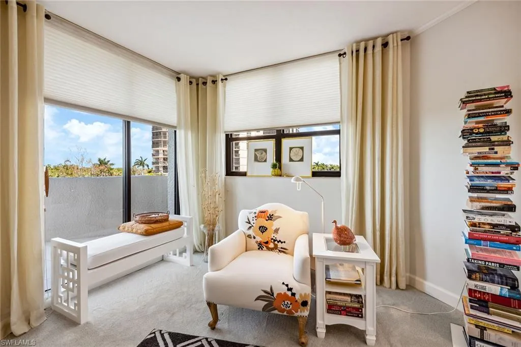 Experience the pinnacle of luxury living in this remodeled second-floor residence in Pelican Bay. This two-bedroom plus den, two-and-a-half-bathroom condo boasts over 500 square feet of wrap-around balcony space, offering serene long preserve views that bring nature’s beauty to you. Step inside to find a meticulously remodeled interior featuring diagonal tile floors, recessed lighting, modern fixtures, and stylish window treatments that flood the space with natural light. The updated kitchen is a chef’s dream, with white shaker-style cabinets, a built-in coffee station, sleek Corian countertops, a large center island, and premium Thermador induction cooking appliances. The versatile den, accessed through French doors, includes a custom built-in Murphy bed and desk, seamlessly blending form and function. Retreat to the owner’s suite, complete with plush carpeting, an expansive walk-in closet, and an updated spa-like en-suite bathroom featuring a dual sink white vanity with designer mirrors flanked by light sconces, and a walk-in shower with a frameless glass enclosure, complemented by a deep soaker tub on an elevated riverstone floor enhanced with a stylish floor-to-ceiling waterfall design tiled wall. Additional highlights include an updated guest bathroom, 5G wiring, a NEW disposal, NEWER carpeting, NEWER water heater, NEW trickle charger for the parking space, dedicated laundry room, and two storage units. Residents can also take advantage of the building’s guest suites for visitors. Living in Pelican Bay means enjoying exclusive access to a private beach club, a resort-style pool, a state-of-the-art fitness center, and 24/7 security. With a panoramic elevator and world-class amenities, this property offers an unparalleled lifestyle in one of Naples’ most sought-after communities.