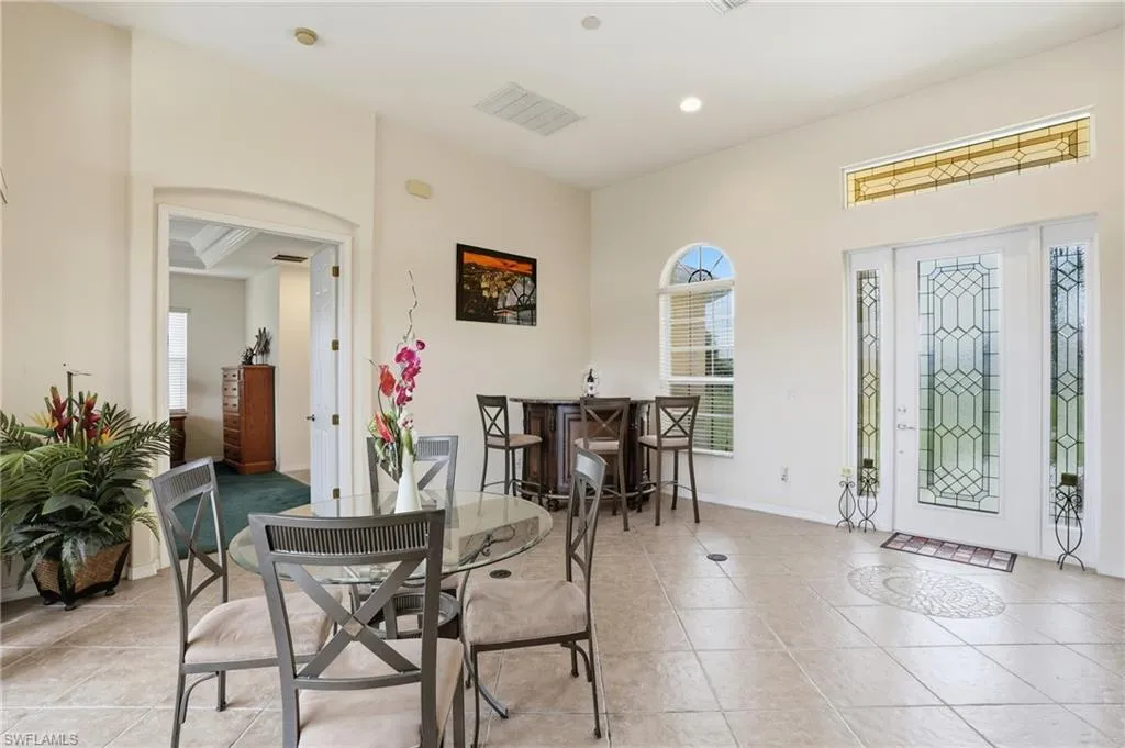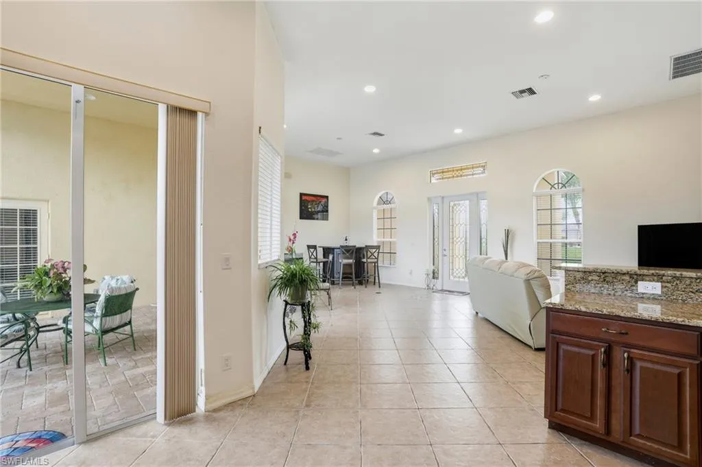 The great room design features soaring ceilings and a seamless flow between the living, dining, and kitchen areas — ideal for both daily living and entertaining. The large kitchen offers ample cabinetry and counter space, with plenty of room to add an island if desired. Sliding glass doors from the kitchen, dining, and living areas open directly to the screened pool lanai, blurring the line between indoor and outdoor living and filling the home with sunlight.