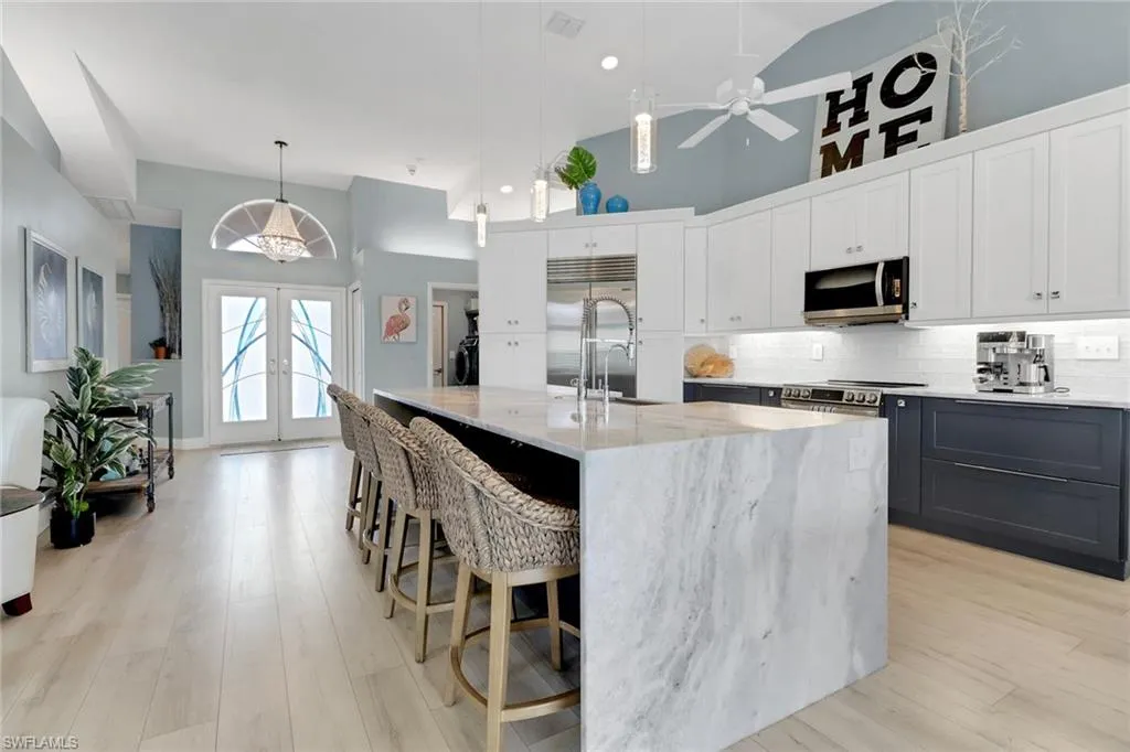 The heart of the home is its spectacular chef’s kitchen, featuring a new oversized waterfall island that serves as both a stunning centerpiece and a highly functional space for entertaining. The majority of the home showcases all-new vinyl plank flooring with a light, beachy vibe. The primary suite offers a spa-inspired bathroom with a waterfall shower and closet with ample room and shelving.