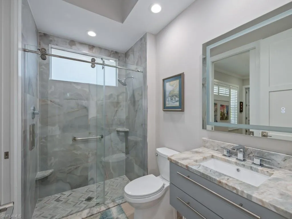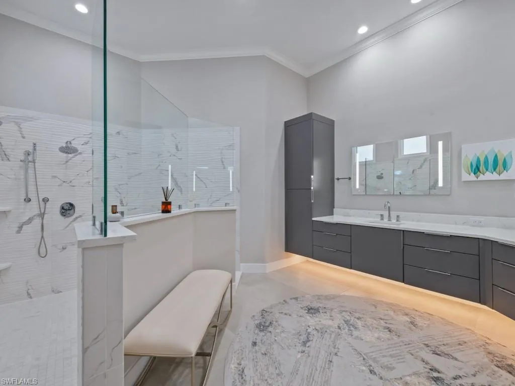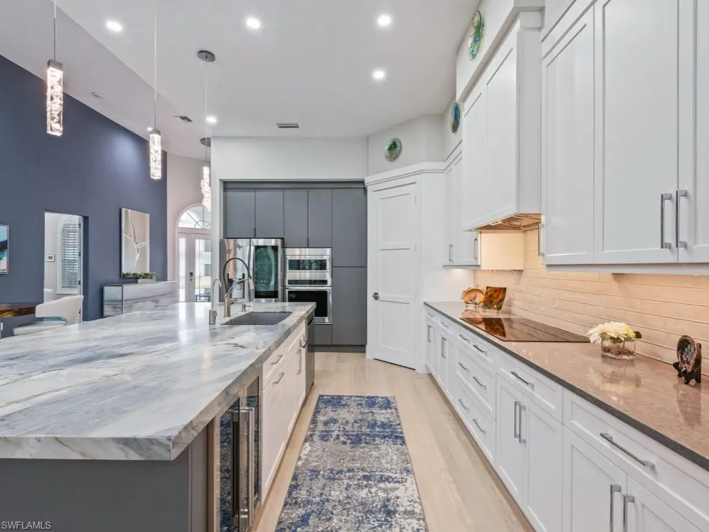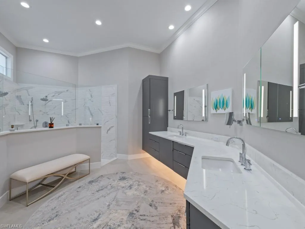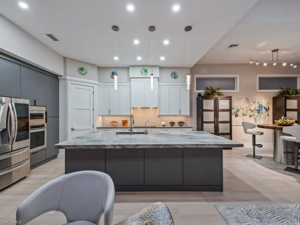 Framed by sweeping fairways and calming waters, this Coconut Isle residence pairs timeless design with today’s most sought-after luxuries. The chef-inspired kitchen is the heart of the home, crafted for both culinary creativity and stylish entertaining. Outfitted with custom Florida Design Cabinetry, quartz and quartzite surfaces, hidden outlets, soft-close cabinetry with slide-outs, and a full suite of premium appliances, it balances elegance with practicality. A dedicated wine cooler and motion-lit pantry elevate the experience even further. The primary living and dining space seamlessly extend outdoors through new impact glass sliders with a discreet motorized no-see-em screen, connecting to a lanai that showcases the true spirit of Southwest Florida living. With its picture window cage, saltwater pool and spa, and iAquaLink smart controls, this outdoor sanctuary is designed for both peaceful mornings and lively gatherings. The primary suite is a private retreat of thoughtful luxury. From motorized blackout shades and a custom closet with built-ins and a safe, to the spa-like bathroom featuring an expansive walk-through shower, floating cabinetry with soft lighting, heated towel rack, and built-in medicine cabinets with charging ports, every detail has been carefully curated for comfort and convenience. Two additional guest suites each offer beautifully renovated baths with lighted mirrors, tiled showers, and modern barn doors, ensuring visitors enjoy the same refined lifestyle. The versatile bonus den/office, complete with access to a full bathroom, provides the flexibility to function as a home office, creative retreat, or even a spacious spare bedroom when needed. A redesigned laundry room and climate-controlled garage—complete with EV charger, battery backup power supply, epoxy flooring, and Mitsubishi mini split—bring unmatched practicality to everyday living. Beyond the walls, peace of mind comes from extensive updates: a newer roof (2019), dual new AC units (2023) with air purification, hurricane-impact doors, Wi-Fi locks, surge protection, and full smart-home integration. As a resident of Bonita Bay, you’ll enjoy exclusive access to a wealth of amenities including a private beach park, the popular Backwater Jack’s Restaurant, and several community parks. Riverwalk Park offers a kayak, canoe, and boat launch, along with pickleball and tennis courts for active living. For golf enthusiasts, there’s an opportunity to join the Country Club, which boasts five championship golf courses, a sports/racquet center with a resort-style pool, and a state-of-the-art fitness facility, along with a luxury spa and salon. Don’t miss your chance to own this exceptional property in one of Bonita Bay’s most sought-after neighborhoods, where luxury living meets nature’s beauty. Schedule your private tour today!