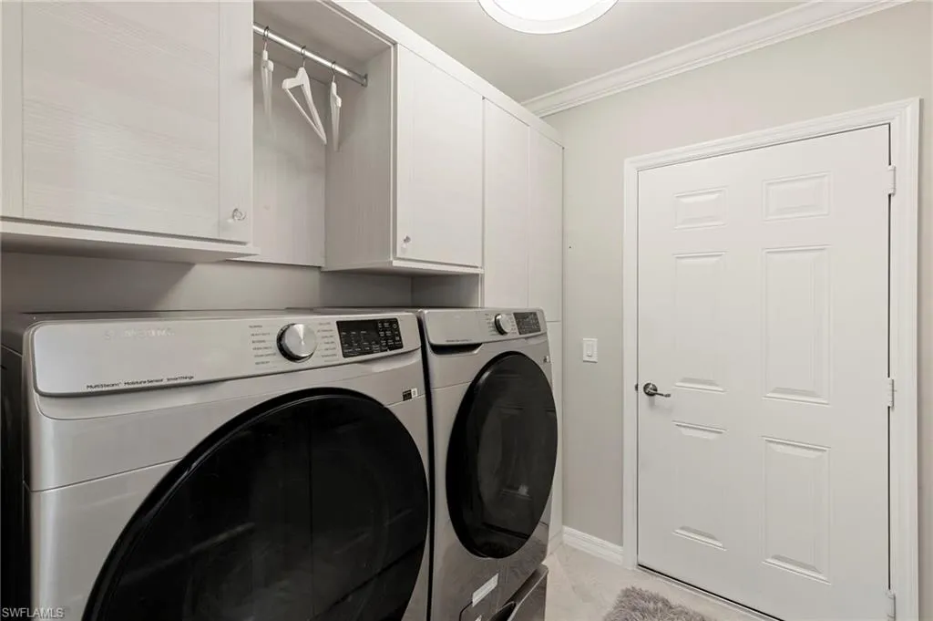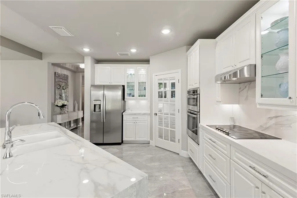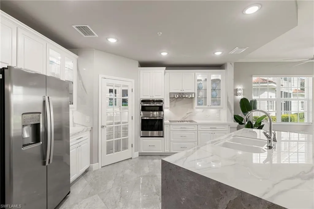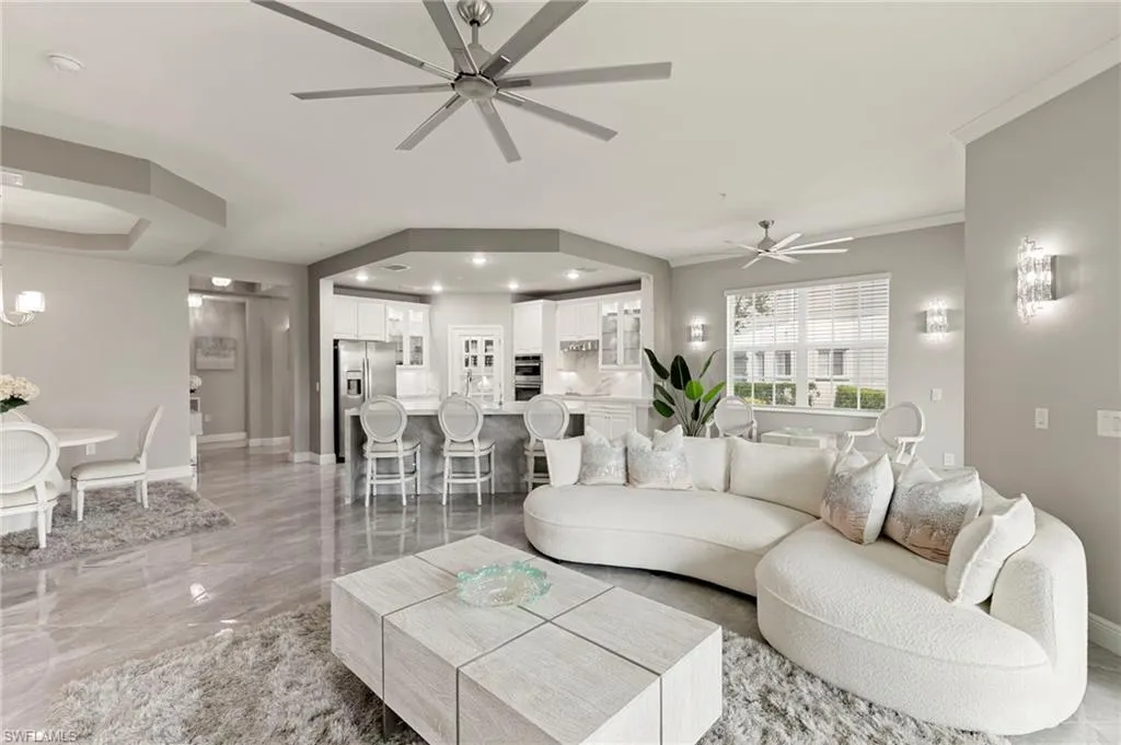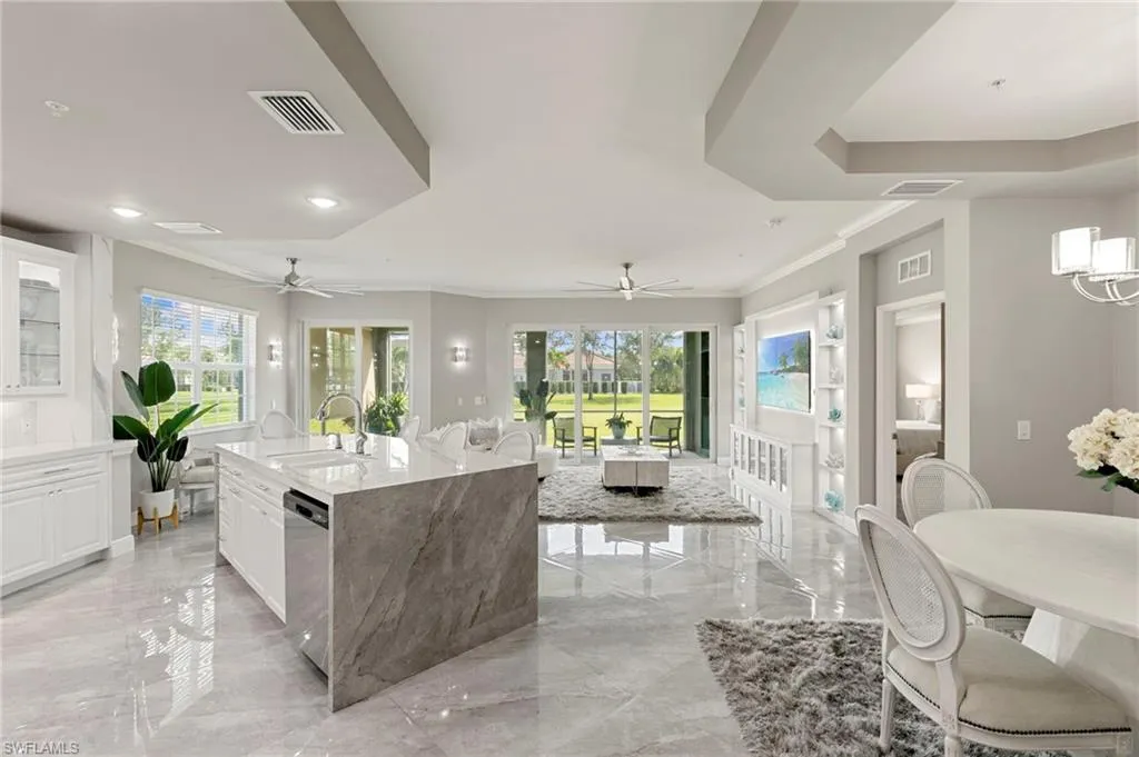 Stylish and move-in ready, this beautifully remodeled 3-bedroom, 2-bath first-floor residence in the guard-gated community of Santa Luz blends coastal contemporary design with everyday functionality. From the moment you step inside, you’ll notice the upgrades: designer pendant lighting, under-cabinet illumination, and sleek 33” porcelain tile flooring throughout. The open-concept kitchen is the centerpiece, featuring stainless steel appliances, wall oven, electric cooktop, a sleek upgraded island, and a custom walk-in pantry, making both cooking and entertaining a joy. The calming color palette of the primary suite creates a serene retreat with more custom-built closets and an en-suite bath, with separate water closet for convenience. A large screened patio with sunny southern exposure is just steps from the community pool, creating the perfect spot to relax or entertain. An attached 2-car garage leads to a well-planned laundry room with raised front-load washer and dryer with built-in cabinets and abundant storage adding the home’s functionality. Whether you’re seeking a seasonal getaway or a full-time residence, this home offers the perfect blend of style, comfort, and peace of mind—all in one of Fort Myers’ most desirable communities. Best of all, it’s located in a NO flood zone, giving you added security and long-term value.