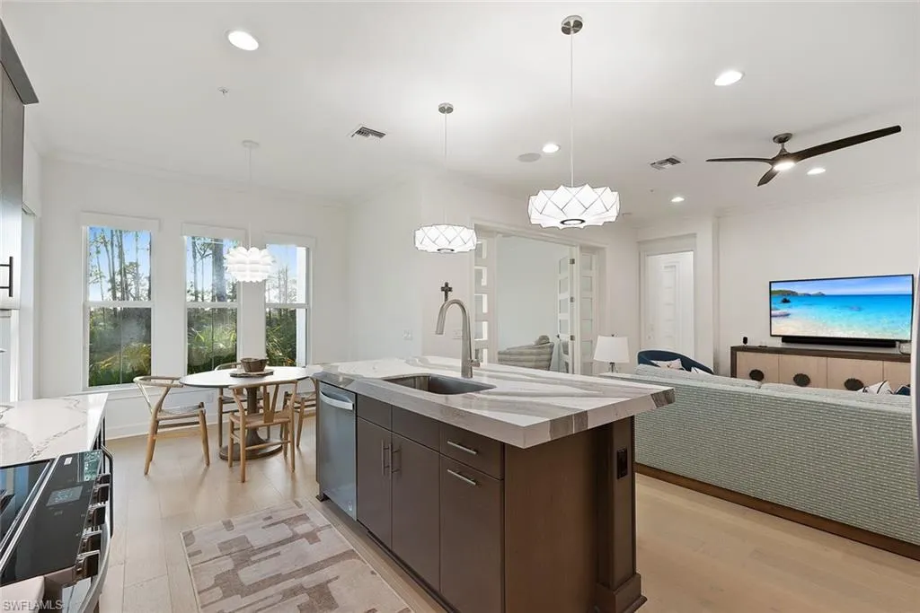 Proud to present this wonderful end-unit first floor coach home, positioned on a quiet cul-de-sac, surrounded by natural beauty outside, with abundant natural light throughout inside, perfectly situated on an oversized, end lot. Embraced by luxury this beautiful home is being offered turnkey furnished, featuring open-concept living with upgrades galore, 3 bedrooms, 3 bathrooms, Den, French doors onto a beautiful Sunroom and oversized 2 car garage. Tasteful window treatments adorn every room. The primary suite is a precious retreat with generous bathroom and large walk-in closets. Enjoy relaxing with family and entertaining friends at spacious island counter in the well equipped kitchen with soft close cabinetry, quartz countertops, and kitchen pantry.