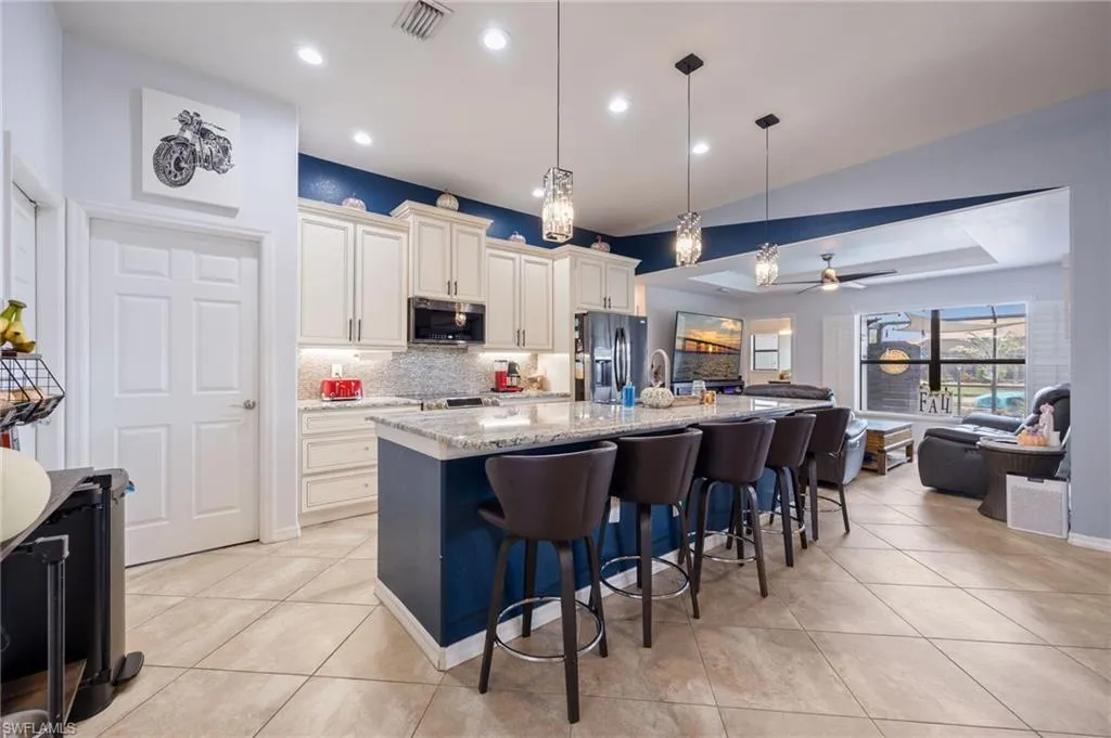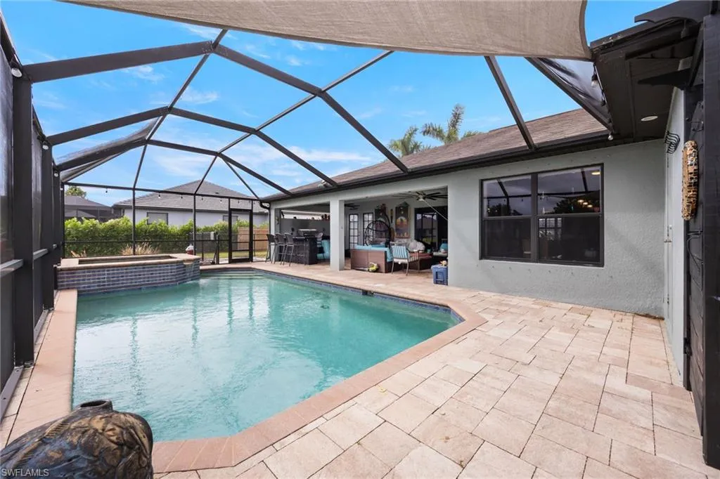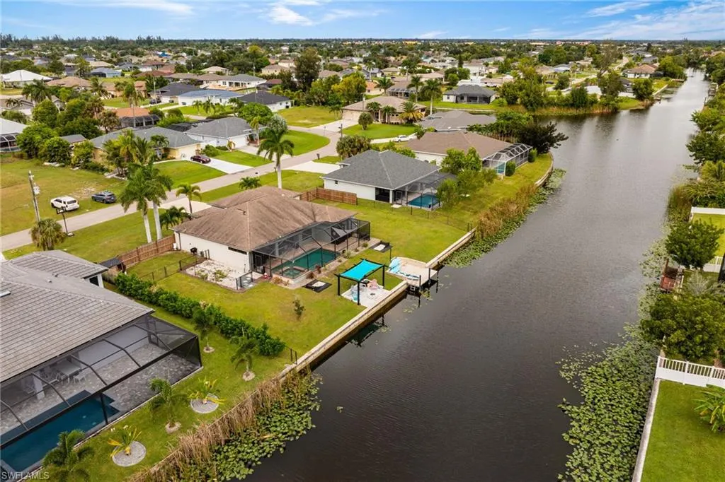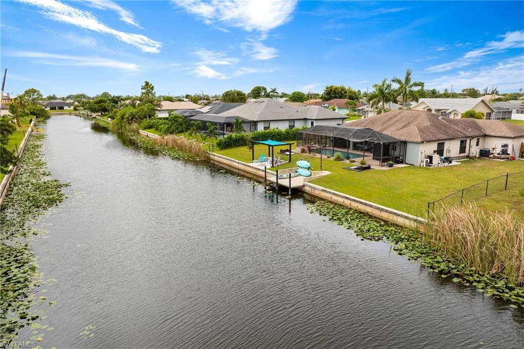 Experience the Best of Florida Living. This waterfront home is nestled on a triple-lot site in a No Flood Zone, offering plenty of space for outdoor enjoyment. Perfect for your furry companions to roam freely! As you step inside, you’ll find 3 bedrooms plus a den, ideal for a home office or additional guest space. High coffered ceilings and an open-concept kitchen create a bright, airy ambiance. Soft-close light cabinetry, a spacious granite island with seating for guests, and modern pendant and recessed lighting. Stainless steel appliances include an induction cooktop, providing both efficiency and style. Easy to maintain tile and wood laminate flooring run throughout the home. Step outside to your private oasis. A spacious pool and spa, both of which can be heated to enjoy year-round. A convenient outdoor shower is available for rinsing off after a swim, and the fully equipped outdoor kitchen makes entertaining perfect. Enjoy the view and a day of fishing on the dock and a waterfront firepit to enjoy on a cool night. Located just minutes from schools, shopping, dining, and only a short drive to Florida’s world-renowned beaches and resorts. Make this your Florida dream home today!