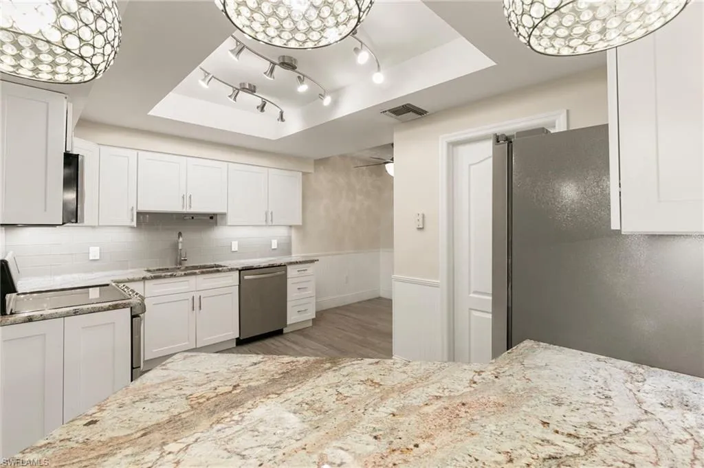 This spacious 3 bedroom updated second floor condo is located at the South end of Marco Island. The location is close to beach, Caxambas park, and Marco Walk Plaza. Easily accessed by either elevator or stairs. Located on Caxambas pass the building has a beautiful roof top deck with 360 views. This is a great place to settle in and read or view the sunset. This condo has two very large screened balconies, one facing West and one with a view of the pass. This condo has been beautifully updated including new kitchen and baths, appliances, flooring and shutters. The eat in kitchen offers stainless appliances, granite and newer white cabinetry. Walk in laundry room includes extra storage and a utility sink. Split bedroom floor plan affords privacy. The electric shutters can be conveniently operated from your phone app. Loads of closet space though out this condo. The primary bath has walk in shower, large vanity (plumbed for 2nd sink) plus bidet. The building has excellent amenities including available docks for very reasonable lease, guest suite for lease, social/party room, sauna, pool and spa, BBQ grill, covered parking and a very large exterior storage space. Building has completed its structural integrity study. Seawall has been replaced. This is a wonderful residential building, offering excellent location and space.