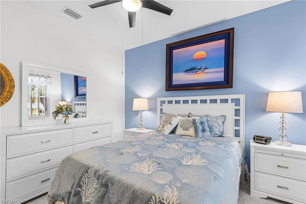 A must see villa with a great backyard setting to enjoy the screened lanai with private pool and additional lighting. There is a screened slider on the lanai that leads to the living room with crown molding and remote Roman Shades. This 3 Bedroom home boasts many upgrades starting with a screened entry with glass insert front door. There are tile floors through the main living area, Luxury Vinyl Plank flooring in the Primary and new carpet (2025) in the guest rooms. The Kitchen has beautiful two tone cabinets with under cabinet lighting, an Island and wine bar with pull out shelves, additional cabinetry in the eating area plus a Keurig coffee maker with a direct line. There are newer LG appliances with transferable coverage (5/2026). Other upgrades: Hurricane Shutters, whole home water purifier and RO (2020), Hot Water Heater (2021), HVAC with UV Light (2024), new pool pump (2024) and all LED lighting. The interior was painted (2024), exterior painted (2025), roof baffles and vents resealed (2024), fresh landscaping (2024) roof cleaned (2025) and tile floors sealed (10/2025) with a 5 year transferable warranty. There is a portable whole home generator (2024) and lanai TV that will convey with the home. This home has it all where you can move right in and start to enjoy your new resort lifestyle. Pelican Preserve is a nationally recognized active adult 55+ community with endless amenities including the Flip Flops outdoor restaurant, 3 pools, Tennis, Pickleball, Bocce, Softball, Fitness, Movie Theater, Billiards, Hobby Rooms, Amphitheater, Destinations indoor restaurant, plus many special events throughout the year. The Brokke Center includes a Library, Card Rooms and Coffee Center for socializing with friends. Pelican Preserve has a 27 hole Private Golf Club with optional memberships. Pelican Preserve is a short drive to RSW Airport and many shops and restaurants and the gulf coast beaches. It’s time to call this your next home. Some furniture is available in a separate bill of sale.