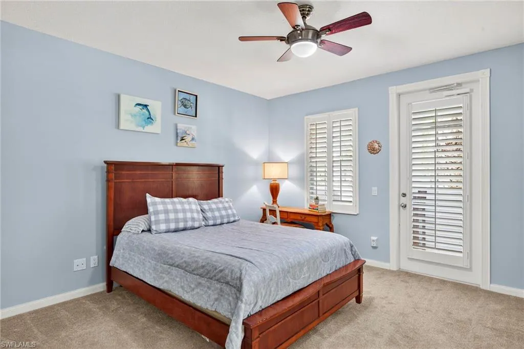 Discover your dream home in sunny Southwest Florida! This beautifully maintained “Cayman” townhouse offers three spacious bedrooms—including a convenient ground-floor suite with a built in Murphy bed and a private porch entry and two upstairs master suites, one featuring its own balcony, 3 full bathrooms and a two-car garage. This property is move-in ready for you to start enjoying the Florida lifestyle. Step inside to find easy to maintain ceramic tile floors on the 1st floor, plantation shutters, and a welcoming Florida color palette accented by crown and chair rail molding. Decorative ceiling fans and stylish light fixtures add comfort and charm throughout the home. The kitchen is perfect for entertaining and family gatherings, boasting island-style granite countertops, ample cabinetry, stainless steel appliances, a modern backsplash, and undercounter lighting for a warm ambiance. The welcoming great room features oversized glass sliding doors leading to the screened lanai, which displays a beautifully hand-painted coastal mural. This space is ideal for enjoying our delightful weather, entertaining guests, relaxing in the heated pool, or unwinding in the shade beneath the electric retractable awning while hosting gatherings with family and friends. Storage is never an issue, thanks to three large walk-in closets with modular organizers, under-stair storage, and plenty of cabinetry in the laundry room. Outside, enjoy fresh paint completed in 2024 and peace of mind with hurricane-ready accordion shutters. To keep you cool new HVAC in 2024. VillageWalk Blvd. is just a short walk, bike or golf cart ride to the amenity rich town center that offers something for everyone: resort style & lap pools, 24/7 fitness center, lighted Har-Tru tennis courts, pickleball center and bocce all with active leagues. In addition, there is a lighted basketball court, tot lot, full-service restaurant w/indoor and outdoor dining, beauty salon, bagel shop, spa, ice cream shop, and lots of planned activities by the full-time activities director. VillageWalk of Bonita is unique with it’s pretty butterfly gardens, miles of lakes, sidewalks, walkways over connecting bridges and impressive wildlife. It’s a great location to our beautiful sandy beaches, SW Florida International Airport, shopping and entertainment destinations. Guard gated, golf cart and pet friendly. Don’t miss your chance to experience the best of Southwest Florida living in this exceptional home!