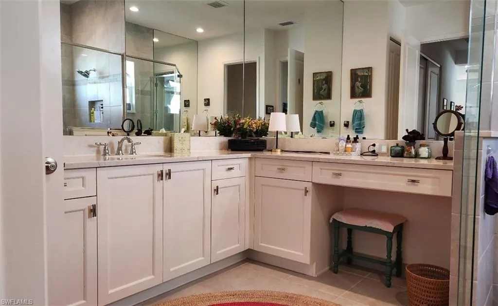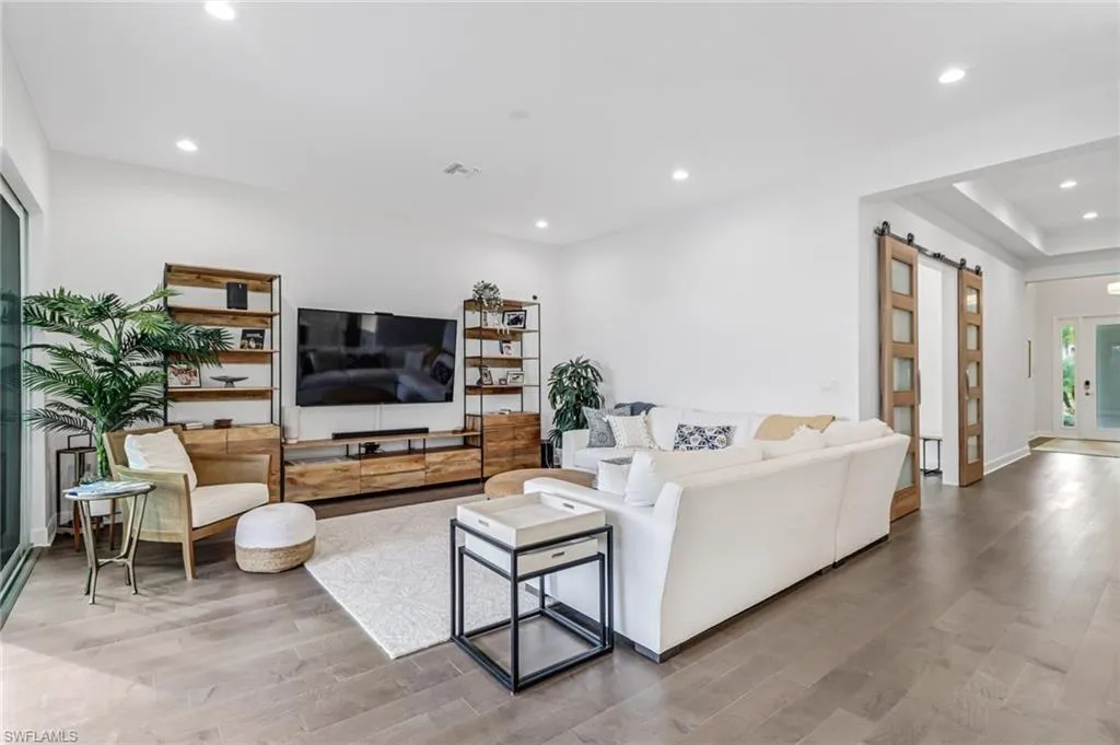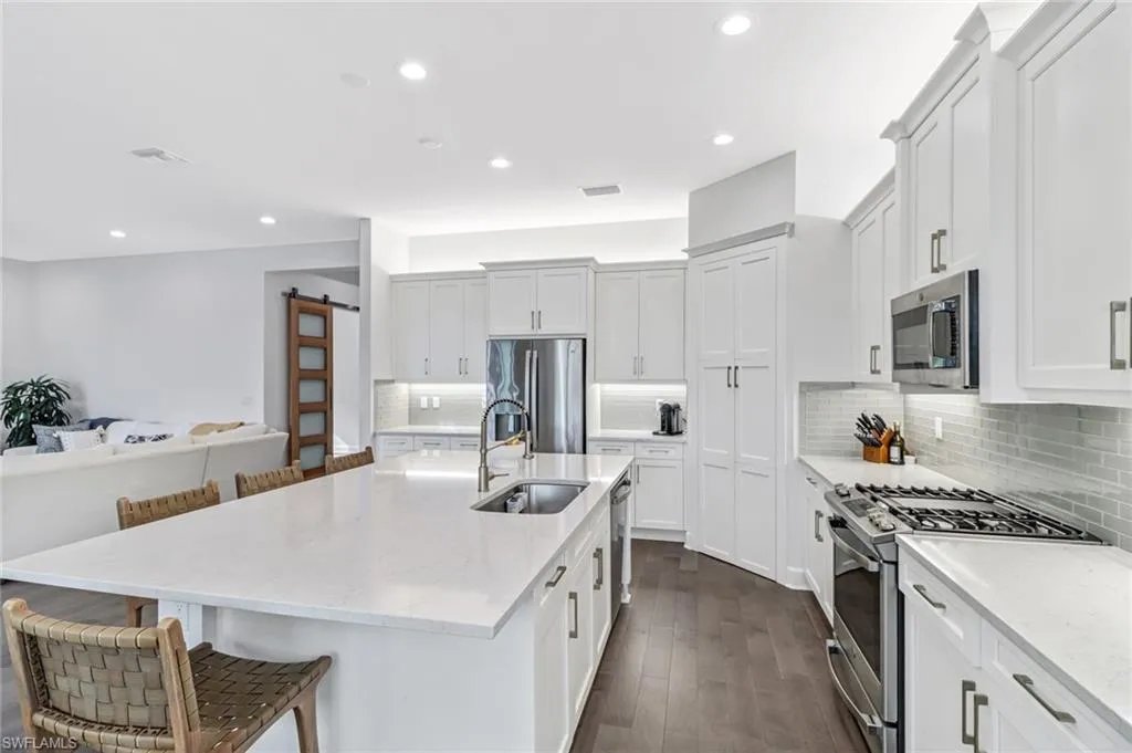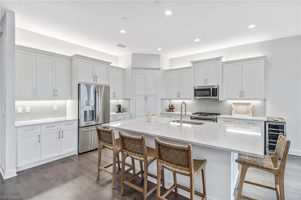 The home features impact glass on all windows and doors, a full security system, and beautifully upgraded, lush landscaping. A spacious extended paver driveway and entry lead you inside, where upgraded recessed LED lighting with dimmer switches creates an inviting ambiance. The kitchen is a true showpiece with upgraded cabinetry featuring soft-close hardware, granite countertops and backsplash, an upgraded faucet and lighting package, and both under- and over-cabinet lighting. A gas cooktop, upgraded appliances, and a wine/beverage refrigerator complete the space for both everyday enjoyment and entertaining. Additional interior highlights include comfort-height soft-closing toilets, luxury-height mirrors to the ceiling in the primary bath, custom barn doors in the third bedroom and primary closet, and professionally designed custom closets in the primary suite. Every bedroom is outfitted with double-cell window blinds for privacy and energy efficiency. Smart home upgrades include a Yale keyless digital front door lock, a secondary Honeywell thermostat with remote app control. The home also features an AC condensation pump and a blue-light airflow mold mitigation system to ensure exceptional air quality. The garage offers epoxy flooring and a convenient hanging storage shelf. Valencia Bonita’s world-class amenities elevate everyday living with a 45,000 sq. ft. clubhouse, full-time lifestyle staff, indoor and outdoor dining, resort, lap, and resistance pools, a state-of-the-art fitness center, nail salon and spa, pickleball, tennis, bocce, a dog park, and even Broadway-style entertainment. All this is just minutes from pristine Gulf beaches, shopping, and fine dining.