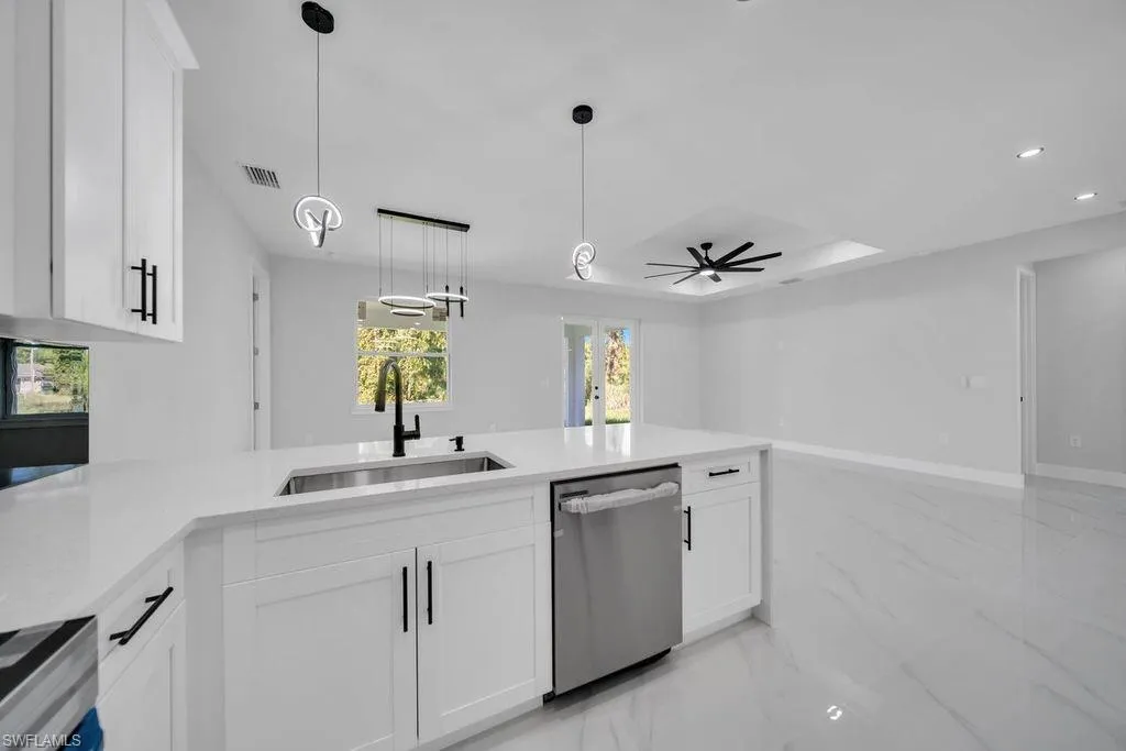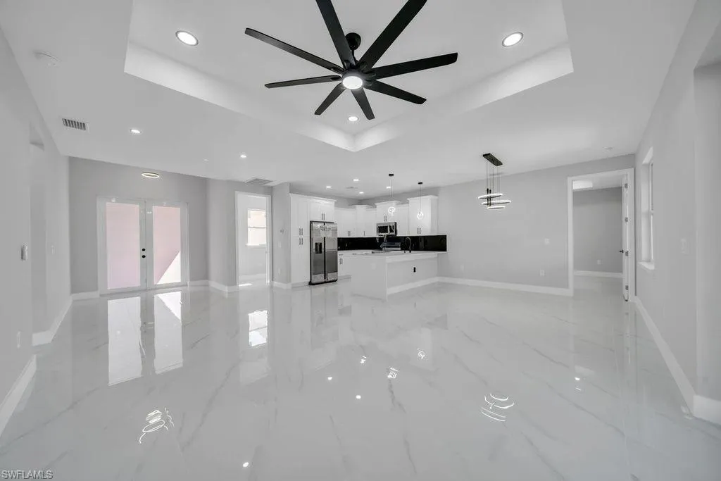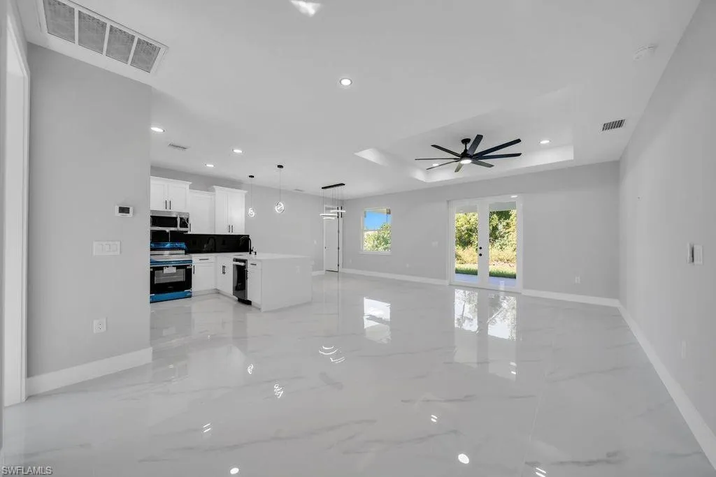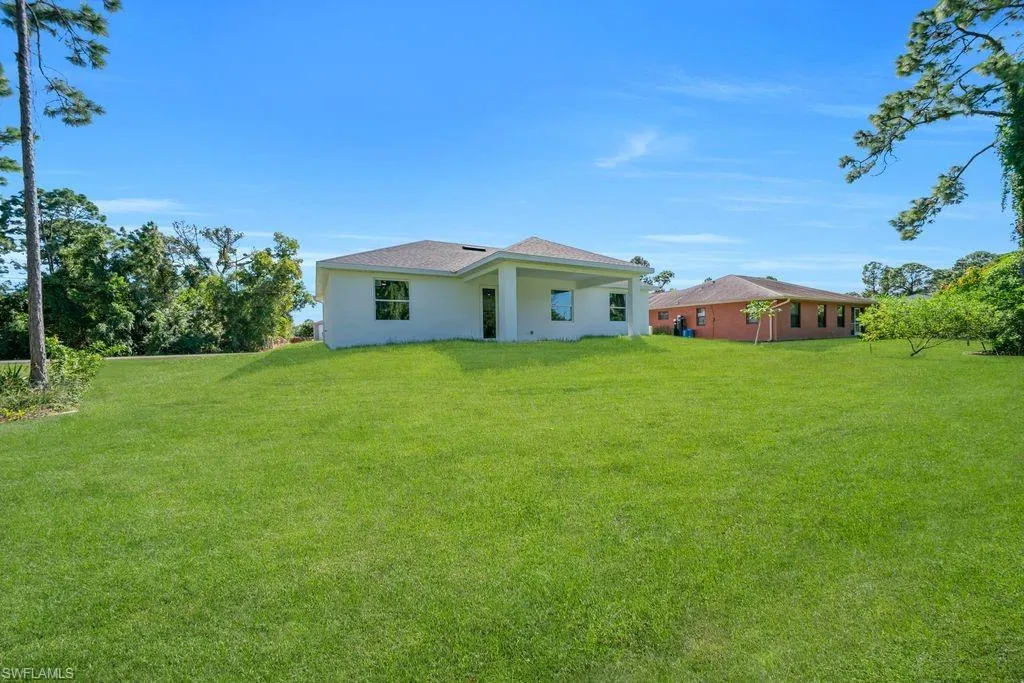 Welcome to an exceptional new construction residence in the heart of Lehigh Acres, where contemporary luxury meets thoughtful design. This impeccably crafted home presents an enticing blend of sophistication and practical living spaces, offering three bedrooms and two well-appointed bathrooms. Step through the elegant double-door entry into a home that exemplifies modern Florida living. The great room design creates an impressive sense of openness, seamlessly connecting living spaces and establishing an ideal environment for both entertaining and daily life. The heart of this home is its beautifully conceived kitchen, featuring a traditional eat-in design enhanced by a generous island that doubles as a casual dining space. Culinary enthusiasts will appreciate the complete suite of new stainless steel appliances, including a refrigerator, dishwasher, microwave, and range. The kitchen’s sophisticated aesthetic is elevated by premium quartz countertops, which extend into the bathrooms, maintaining a cohesive design throughout. The primary bedroom suite stands as a private retreat, boasting a spacious walk-in closet and an elegant bathroom with dual sinks. Two additional bedrooms offer comfortable accommodations for family members or guests, while the second full bathroom ensures convenience for all. Throughout the residence, premium porcelain tile flooring creates a seamless flow, reflecting light and contributing to the home’s bright, airy atmosphere. All windows feature stylish zebra blinds, adding a touch of modern elegance while offering versatile light control. Safety and durability were paramount in the design, with impact windows and doors providing peace of mind during Florida’s seasonal weather. The covered lanai extends the living space outdoors, offering a serene setting for morning coffee or evening relaxation. Professional landscaping enhances the front yard, creating immediate curb appeal and a welcoming approach to your new home. This residence’s location proves equally impressive, positioned just blocks from Lee Boulevard and offering swift access to Fort Myers. The neighborhood boasts exceptional educational opportunities, with schools and a public library nearby. Daily conveniences are equally accessible, with shopping and dining options within easy reach. Notably, this property sits outside designated flood zones, offering additional peace of mind. This new construction represents more than just a house; it’s an opportunity to embrace a lifestyle where comfort meets convenience, where modern amenities blend seamlessly with practical living, and where every detail has been carefully considered to create an exceptional living experience. Don’t let this remarkable opportunity pass you by – schedule your private showing today and step into your future home.