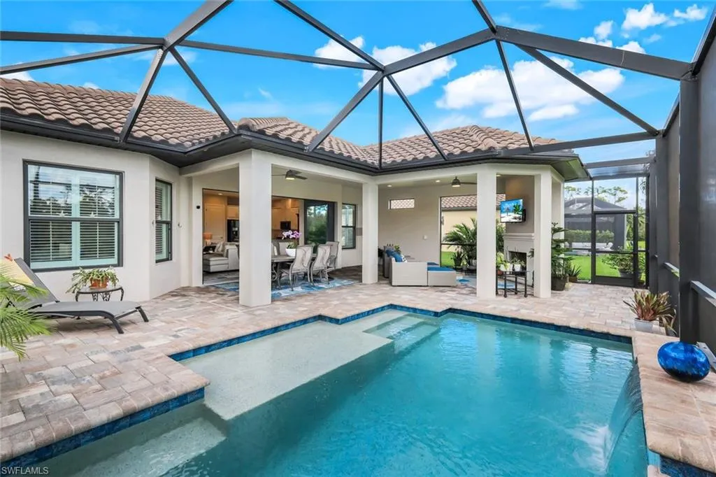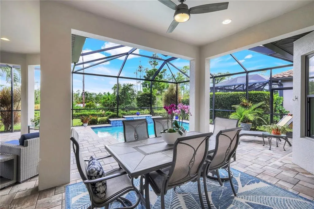 Welcome to your hidden oasis in the community of Estero Pointe. This beautifully designed home blends luxury finishes with thoughtful functionality, offering a serene preserve and lake view with desirable southern exposure. At the heart of the home, the beautiful kitchen features a gas stove, quartz countertops, oversized island with extra storage, shelved pantry, and a casual dining nook that expands your entertaining options. A separate dining room with walk-through access to the kitchen makes gatherings effortless. The primary suite is a true retreat highlighted by a bay window overlooking the lanai and preserve, custom walk-in closet, and a spa-inspired bath with a huge walk-in shower. The spacious guest bedroom has en-suite bath and linen closet. The powder room has a granite vanity. The large den/flex space has beautiful glass french doors providing comfort and versatility for every lifestyle. Step outside to an extended lanai designed for year-round enjoyment, complete with a custom heated saltwater pool featuring a waterfall, sun shelf, and adjustable lighting. The lanai is pre-plumbed for an outdoor kitchen, has a lovely gas fireplace, TV pre-wire, and plenty of space for entertaining. Additional highlights include a tankless water heater, water softener system, wired setup for a portable generator (Owner is leaving Tri-fuel portable generator) luxury vinyl plank flooring, laundry room with custom cabinetry, sink, and shelving. The extended garage has an additional four feet of depth and is finished with a newly epoxied floor and overhead storage that can be raised and lowered for easy access. Beautiful landscaping completes this exceptional property, offering a perfect balance of comfort, style, and Florida living. The home is finished with the peace of mind of impact-resistant windows and doors. Located across US41 from the Estero Country Club, easy access to 75, Gulf Coast Center, Hertz arena, Coconut Point, Sprouts, Bonita and Ft. Myers Beaches. Estero Point is a Natural Gas Community.