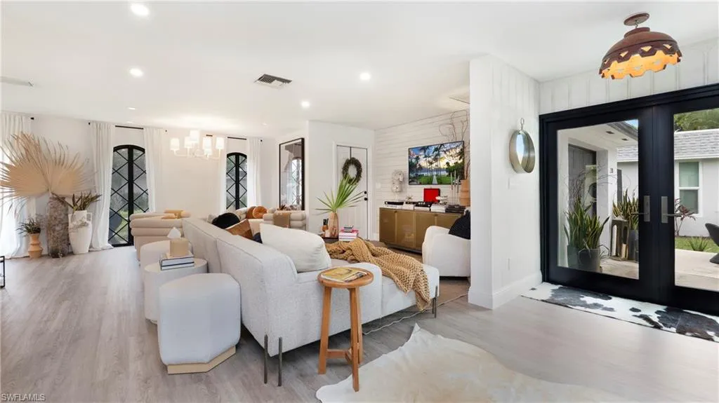 This professionally designed and completely renovated villa features 2 bedrooms plus an open den area and 2 baths, located in the highly sought-after Royal Arms Villas. This home offers an open layout with upscale custom finishes and elegant design details throughout. Enjoy easy, maintenance-free living with impact-resistant windows, a two-car garage, a new roof and gutters to be completed in late November, and HOA fees that include lawn care, irrigation, exterior maintenance, and insurance. This villa combines comfort, style, and an exceptional Naples location—just three miles to the beach and minutes from Olde Naples, Bayfront, Naples Bay Resort & Marina, boutique shopping, dining, and the city’s vibrant downtown lifestyle.