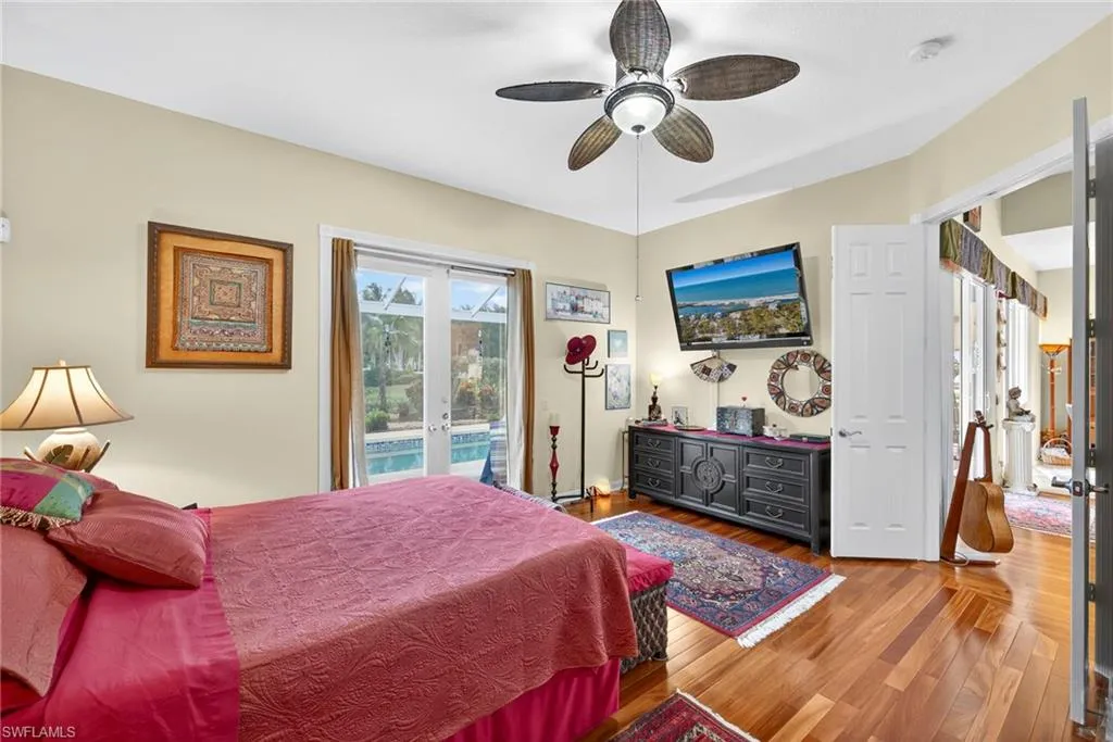 DREAMY DONATELLO!! With its whimsical touches, sophisticated upgrades, charming accents and fantasy pool backdropped by lush foliage and a sparkling lake, 14710 Donatello looks as if it were pulled from a dream!! Set on a quiet location at the end of an impasse street this popular “Oakmont” floor plan features wood and tile floors nearly throughout (cozy carpet in only one bedroom), upgraded kitchen with professionally painted “artist” cabinetry, granite counters, new sink and faucet, 5-person raised breakfast bar and stainless steel appliances (dishwasher is stainless steel veneer); wide open floor plan, perfect southwest facing sunny (sunset) rear exposure, large master suite including soaking tub, 2 sinks, his and hers potties, and dual entry walk-in-shower. Top it all off with 2 large guest bedrooms, spacious guest bath, large laundry room with window, sink and storage cabinets; tall ceilings throughout and lots of wonderful natural light! As for the outdoors, enjoy a gorgeous, private space highlighted by BRAND NEW PICTURE WINDOW SCREENING ON THE POOL CAGE, modern pool with beautiful tile work and recent pool resurfacing, tropical landscape and sparkling lake views, a large covered lanai for entertaining and a privacy wall hiding you in complete privacy!! As for the age of the Key Component; we have a 2020 Air Conditioner, 2018 Hot Water Heater, 2023 Pool Pump, 2020 Splitter Air conditioner for the garage, $25,000 of repairs/replacements on original roof in 2022, including new underlayment in all wall flashing areas, new roof tiles and new roof decking where needed as well as new gutters and more!! As a bonus, enjoy a secret side yard stepping stone garden, a totally air conditioned garage currently used as an art studio, large driveway and more!! This beautiful home is located in San Remo at Bonita Springs, with low HOA fees and no annoying CDD! Amenities include; a resort-style pool, tennis and pickleball courts, fitness room and clubhouse. Also, wonderfully located just a short drive to the area’s best shopping, dining, entertainment, new shortcut road to Naples (Logan), a straight shot to the beaches and close access to a wide open pedestrian biking and walking path connecting all the way from Bonita to North Naples!! Call for your private showing!!