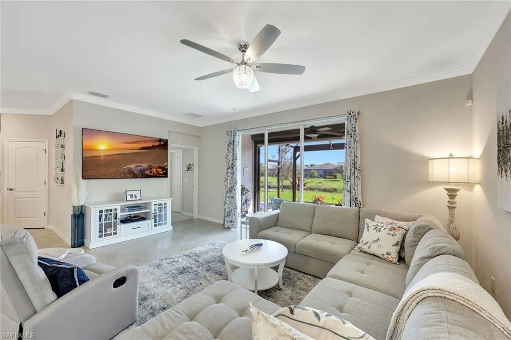 Welcome to Orange Blossom Ranch, a warm community with newer construction, plenty of amenities for an active lifestyle, and a Naples address. This bright and airy 3 bedroom plus den, 3 bath home has it all! From the minute you enter this home you will notice the attention to detail. High ceilings, beautiful lighting choices, crown molding, plantation shutters and a custom-built office space let you see that this home is move in ready! The great room, open to the kitchen, dining area and extended lanai is the perfect place for a gathering of family or friends. The kitchen area, with breakfast bar, pendent lighting, roll out cabinet shelves, quiet Bosch dishwasher, and a walk-in pantry has plenty of counterspace and cabinet space for even the most discerning chef! As it opens to the great room, being in the kitchen doesn’t keep you away from the action! A formal dining area in the great room gives you plenty of seating space. The beautiful and functional custom-built cabinetry in the office makes this room perfect of those working from home or just for quiet computer time. The generous primary bedroom, with view of the lake behind the house, has his and hers ample sized walk-in closets, room for a seating area and can be your sanctuary for reading or relaxing. A split bedroom floor plan offers privacy for you and your guests with each bedroom having its own en-suite bathroom. The extended lanai, with picture screen, offers serene sunset and lake views. The two-car garage, with two large overhead storage racks, provides plenty of extra storage room. Orange Blossom Ranch amenities include resort style pools, playground, tennis/pickleball, basketball, and sand volleyball courts. A fully equipped Fitness Center and Clubhouse provide multiple places for your enjoyment and community activities! The community has easy access to Naples, fining dining, shopping and is a short distance to I75 with easy access to RSW airport. Brank-New Publix just outside of the gate, New Aldi, ACE Hardware, Gas Station and Car Wash in just a few minutes’ drive.