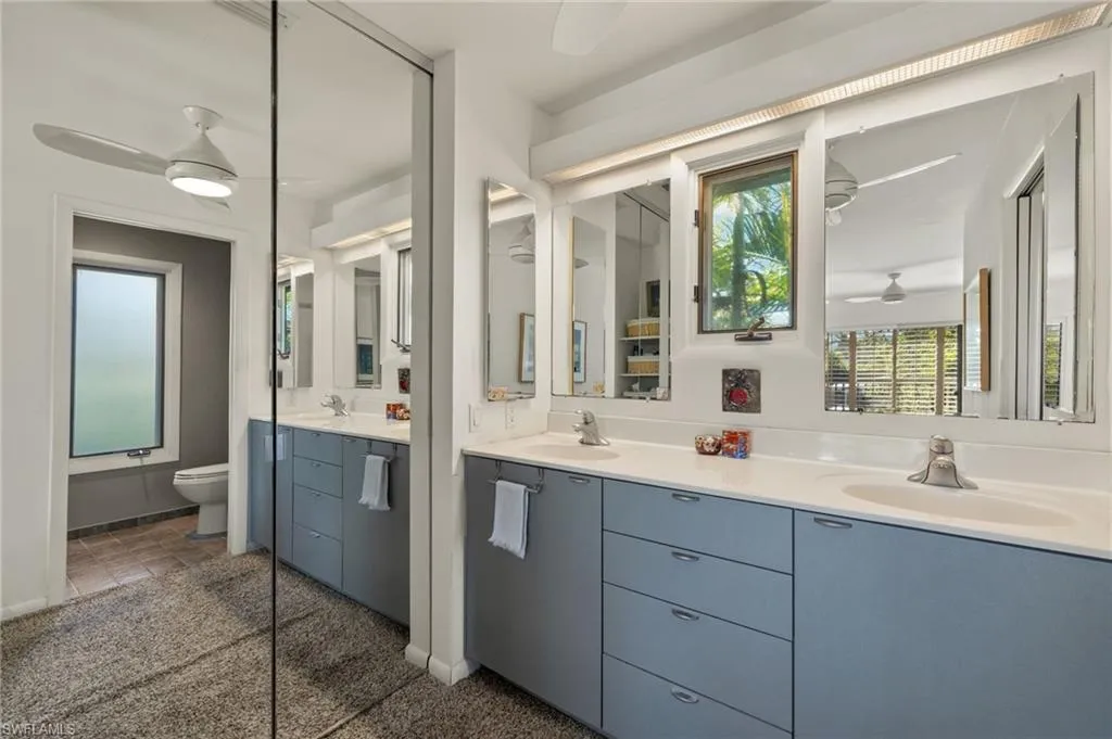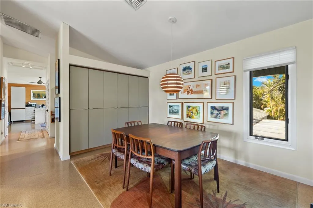 Discover this custom home located minutes from Olde Naples, White sand beaches beaches and shopping dining and entertainment of 5th Ave. South, and 3rd St. South. This distinctive home features a spacious second-floor layout, complete with an oversized screened porch perfect for unwinding and enjoying the peaceful views. Each unique room is designed with special touches, including a gourmet kitchen equipped with a gas and electric cooking options. The expansive living room and dining area boast wall-to-wall sliding doors that open to a generous porch, enhancing the indoor-outdoor living experience. The master bedroom suite includes a well-organized walk-in closet, double vanities, and a tiled walk-in shower. The extra-large second bedroom can easily be adapted into two rooms or utilized as a spacious mother-in-law suite, complete with a full bath. As an added bonus, the first floor features a roomy air-conditioned studio with a private entrance, a separate workshop, and two large carports with roofing. This meticulously maintained home includes impact windows, a new roof, and a new A/C system. Do not miss your opportunity to own a one-of-a-kind home in the heart of Naples!